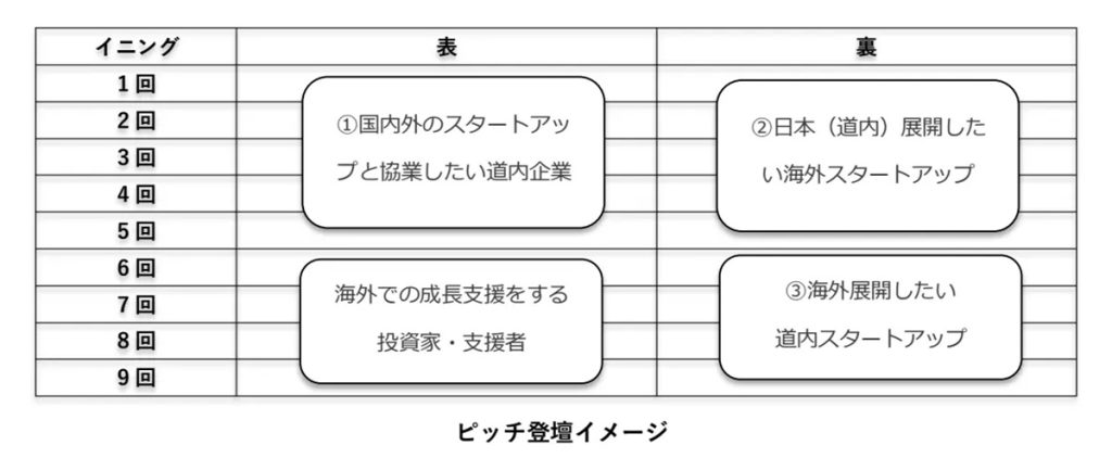 Specifically, 18 pitchers (people who pitch) will be invited to speak on the stage, in analogy to the front and back of a 9-inning baseball game, or a total of 18 innings. Speakers are currently being arranged in three categories: (1) companies in Hokkaido that wish to collaborate with startups in Japan and overseas, (2) overseas startups that wish to expand their business in Japan (in Hokkaido), and (3) startups in Hokkaido that wish to expand overseas. After the pitches, a networking event is scheduled to be held at the Soratobaba Craft Beer Brewing Restaurant, Food Hall, and Sauna in Escondido Field, where the speakers will meet with investors, supporters, and other participants.