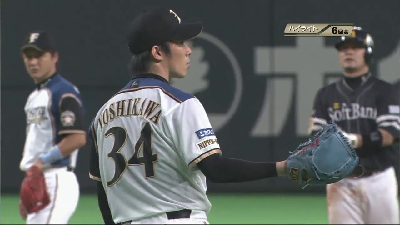防御率トップの吉川光夫、2位の大隣憲司の投げ合いとなった試合は、両雄一歩も譲らず、スコアボードには「0」が続く。8回、均衡を破ったのは北海道日本ハム・小谷野栄一。タイムリーヒットを放ち欲しかった先制点をもたらすと、吉川光夫は最後まで投げ抜き完封勝利とした。(2012年9月14日 北海道日本ハムファイターズ対福岡ソフトバンクホークス)