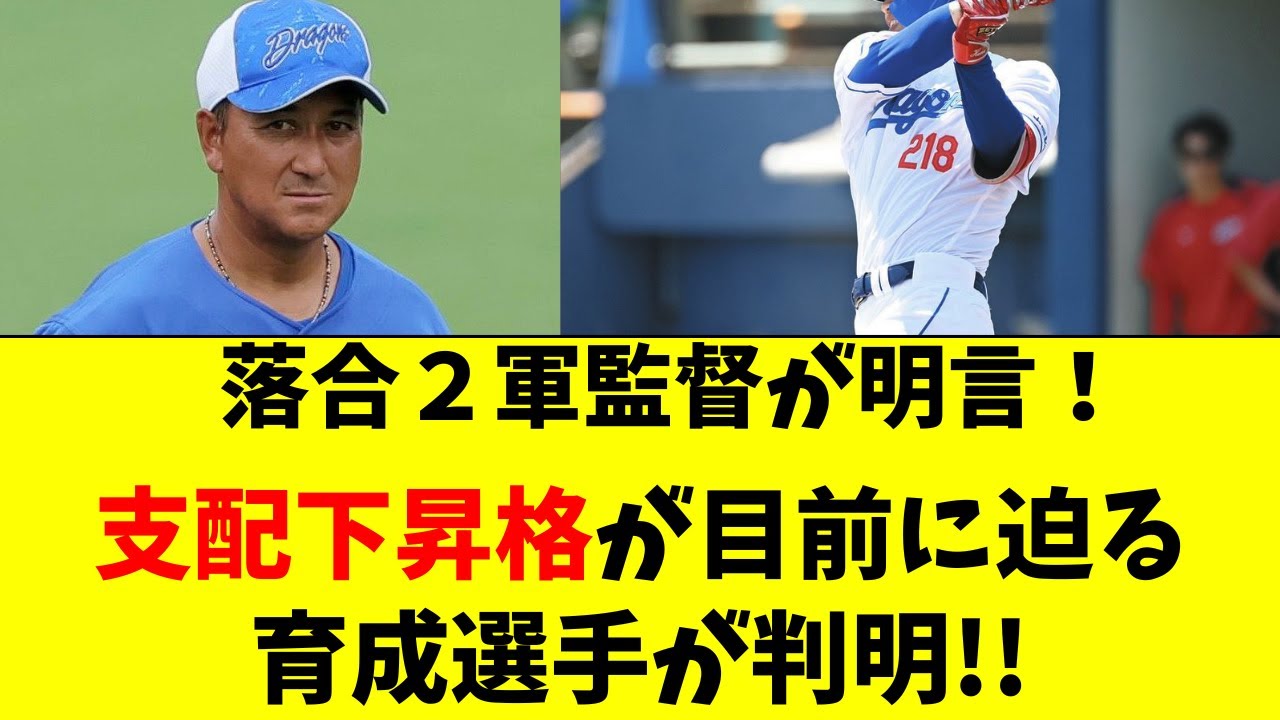 落ち合い2軍監督が名言支配下昇格が目前 に迫る育成選手が判明したということで 詳しく見ていきたいと思います お2軍監督こんなコメントを出しました今 はチーム事情もあってファーストを守って いるけれども内アはどこでも守れるのが この選手の強み最大の持ち味は バッティングインサイド内閣のボールの さき方は転生のものがあるととある選手に ついて大絶賛していますまこの育成選手が 試合に1番近いということでですね現状 中日はABCと3つに分れているんです けれどもしばらくこうA半でプレイして いるという選手です現状中日試合化枠は 67人ということになっていて上限の70 名には3名ぐらい空がありましてまかなり 余裕がある状況ではあります7月末が試合 化昇格の期限になるんですけれども残り1 ヶ月半ほどでま上限3名ということになり ますのでまここは上がってくる選手が出て くる可能性がありますそしてこの内野手 っていうのが特に故障者負傷者が多くて 先日は高井俊選手が長期離脱になった ばかりですそして福永選手であったり中田 翔選手なんかも故障中でまレギュラーも 固定しきれていない石川選手もなかなか 調子上がってこないというところで育成 から内野手が試合化に上がってくるっ ていう可能性は十分ありますまこの中で ですね落ち合い2軍監督が絶賛している 育成選手について見ていきたいと思います 落ち合い監督がざししたのが川上D選手 24歳2年目の選手です体力があって肩が 強いショートとして九州の独立リーグから 育成で指名を受けましたプロ入りの時点で 奥様とお子様がいらっしゃるということで ちょっと慰例の選手ということでこの点が 少し話題になりましたただ元々独立リーグ 時代からすごく注目されていた選手では ないので正直そんなにこう情報が出てこ ないぐらいのそんな選手ではありました そして昨シーズン1年目は2軍でも打率が 0割部一輪とま相当苦戦しましてちょっと 厳しいかなという風に思われたんです けれども秋のフェニックスリーグで一気に 成績を上げてきてそして今年ですね大きく 成績を伸ばしていますここまで2軍では 54試合の出場で2割6部2輪ホームラン が1本打点が2513等塁の4つ失敗出塁 率が3割8部1人OPSが708という 成績になっています育成選手ながらも2軍 で最も打席数与えられているのがこの川上 選手で4番を任されることもありますし かなり期待されていることが分かります 今年は守備チは元々ショートの選手なん ですけれどもショート守っておらず ファーストセカンドサードを守っています フォアボールの数がここまで33個となっ ていてこの数字が全球団ダトかなりフォア ボールを取っていますそして盗塁13個も 小田選手について全球団で2位ということ になっています間の守備で見ますと確実性 の面っていうのは昨年から課題があるん ですけれども動きっていうのはそこまで 悪くないですし24歳で全盛紀を迎える ような年齢になってきますし支配化昇格 っていうのも今年中に可能性としてはあり ますし注目していきたいと思います是非 チャンネル登録グッドボタンお願いします ご視聴ありがとうございました