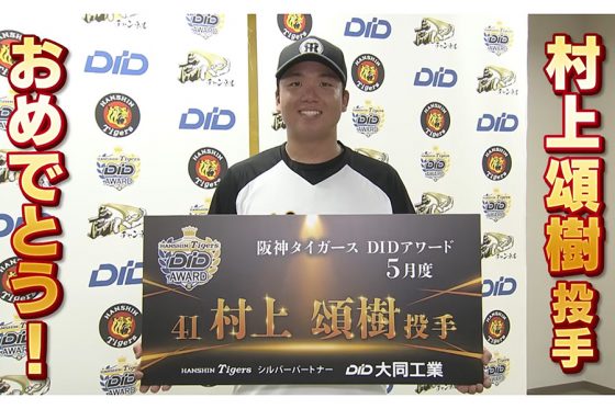 5月10日の中日戦、98球で投手戦を制し、“自身初のマダックス”を達成したことが阪神ファンの支持を集め、5月度の「DID 大同工業 presents 阪神タイガース DIDアワード」に選ばれた村上頌樹投手が授賞式に臨み、「達成できてうれしいです」と喜びを語った。
