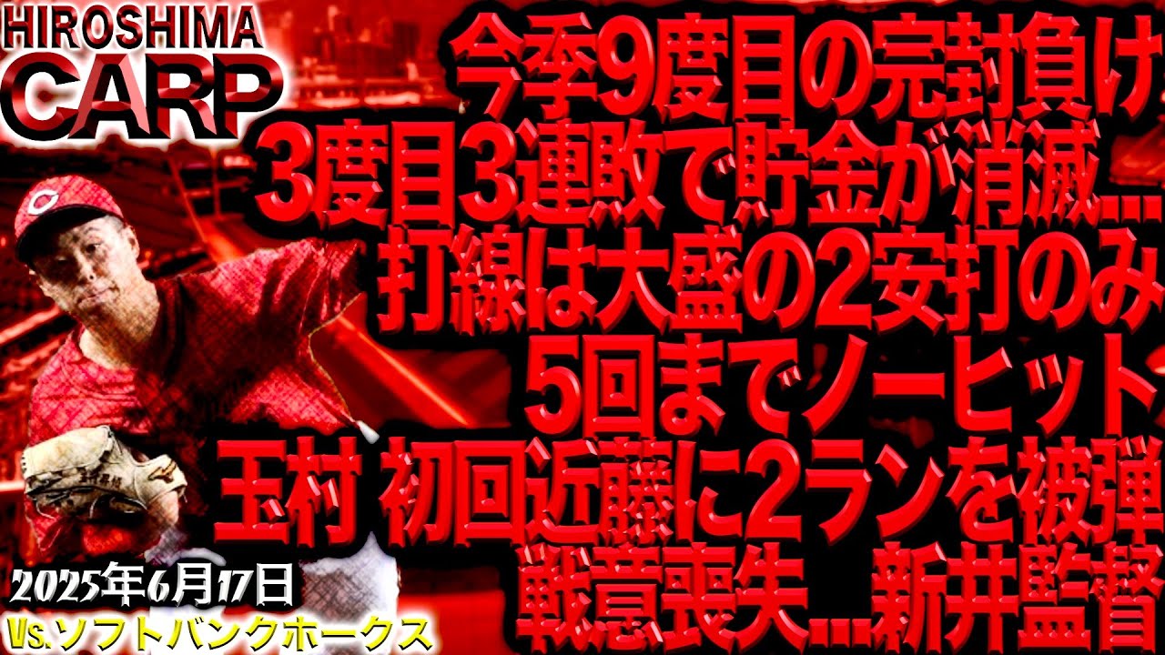 お疲れ様ですKTです今日は6月の17日 ということで本日もKTチャンネルご視聴 いただきましてありがとうございますはい ごめんなさいえ私ですね今日は仕事で 帰り際にはまりましてですね仕事終われた のが8時半過ぎとえいうことでまそこから 着替えたり駐車場まで歩いたりしてえその 後にスマホを開いたらもうほぼ試合が 終わっていたとえいう状況ですので ちょっと映像の方はねほとんど見てない 状況でえ動画の方を作っているとえいう ことになりますのでその辺についてはえご 了承の方いただきたいなという風に思い ますえスポナビのですね出場成績なんかを 見ながらえ今日は喋っていきたいなという 風に思っておりますはいで効果不ですねま 映像を見てなかったことによってですねえ イライラすらしなかったというようなね 今日1日になっておりましてえ初回からね 映像を見ながらもしくは現地の方え イライラしてえ試合をね見ていたもしくは 応援していたとえいう風に思いますけども まあのなんかヒット10本ぐらい打って こう無得典だったらねどういう内容でどう やってチャンスを逃していたのかなとえ いうのが気になってま見逃した配信もねえ 見ていたかなという風に思うんですけども まヒットは大森選手と2本のみえ5回まで はノーヒットでとえいうところなんでねま 大森選手のその2本のヒット低めのね変化 球をうまくえ対応して打ったヒットはえ しっかりねチェックしましたあと小園選手 の総塁ミスのところもしっかりチェックし ましたただそれ以外のねところは見てい ないとえいう状況なんですけどもえーま 本当にねなんて言うんですかねえ相手の ピッチャーがね有原投手というところも あってまなんて言うんですかこれ申し訳 ないんですけどもえーまこの結果にね すんなり受け入れちゃったという自分もね えいたということは正直にここで申し上げ ておきますはいということでこれでカープ の方は今期9のカ封負けとえなりましてま 去年に比べたらまだいいのかなとえいう ようなね程度のものでありましてえ3度目 の3連敗で貯金が消滅という形になりまし たまただこう借金のところでね1つこう壁 があるのかなとえいうようなねえここで なんとか盛り返すというのはこれまでも 繰り返してきておりますのでえ明日はねえ また勝ってくれるんじゃないかなという風 に期待しておりますはいで明日の話が出た んでもう最初にね明日の話をしておきます とえ予告先発前田投手とえそれからカープ は大セラ投手とえなっております大セラ 投手確か前回ねえいいピッチングでまとめ てくれておりますんでえ千葉ロッテ戦です ねえ7回を投げて2失点とえまとめてくれ ておりますのでえ今回もいいピッチング 期待しておりますまできればねえリズム よく投げていただきたいなという風に思っ ておりますがえ相手のえソフトバンク前田 投手左投げということでちょっと明日の 先発がまたどうなるかというのがね心配 ですねま今日でいくと大森選手しっかり2 本ヒット打っておりますんでさすがにね さすがにここで外すことはないんじゃない かなとえいう風に思いますのでま田中選手 のところは菊選手が入ってセカンドえ セカンドの小園選手がサードに回るとえ いうようなとこはね考えられるんですけど もえー大森選手が外れるようなことがあれ ばさすがにねえ大道大道がえ起きるんじゃ ないかなという風に思っておりますはいと いうことで打線の方はね本当に大森選手の えヒット2本のみということになりまして えま自主トレをね共にした西川亮馬選手 それから今日の対戦相手そしてヒーローえ 決勝通を放っておりますね近藤選手と 実取りを共にしたとえいうところもあり ましてこう近藤選手に感謝するところなん か打ち方もねあの低めに対する反応えもう やっぱりその辺の練習の成果出てんのかな というような雰囲気打ち方になっており ましたんでねえ近藤賢介選手に感謝をし たいなと思いつつもえ決勝ホームラン打た れてねバカだれとえ思うところもあると いうことでねちょっと複雑なえところも ありますけどもま最近流行りのねあの グリップを体から離さないだ方みたいなね えー昔はま上から叩けというところだった んですけどもまそこのね常識を覆した打ち 方なんかをねえこう反復練習で習得してき たというのが今実っているまさに大盛実っ ているとえいうようなところだと思います のでねえここからもですねもう秋山選手に 2度とレギュラー渡さんぞというぐらいの ねえ勢いでえ打ちまくってってほしいなと いう風に思いますでま明日もねえま間違い なく先発だと思いますさっきねちょっと 煽るようなこと言ったんですけどもま 間違いなく先発だと思いますんで対左 ピッチャーに対してもえなんとかね1本で いいと思います1本出せればえ信頼という のはねどんどんどんどん上がっていくとえ いう風に思いますんで明日の活躍も期待し ておりますはいで玉村投手え初回ね近藤 