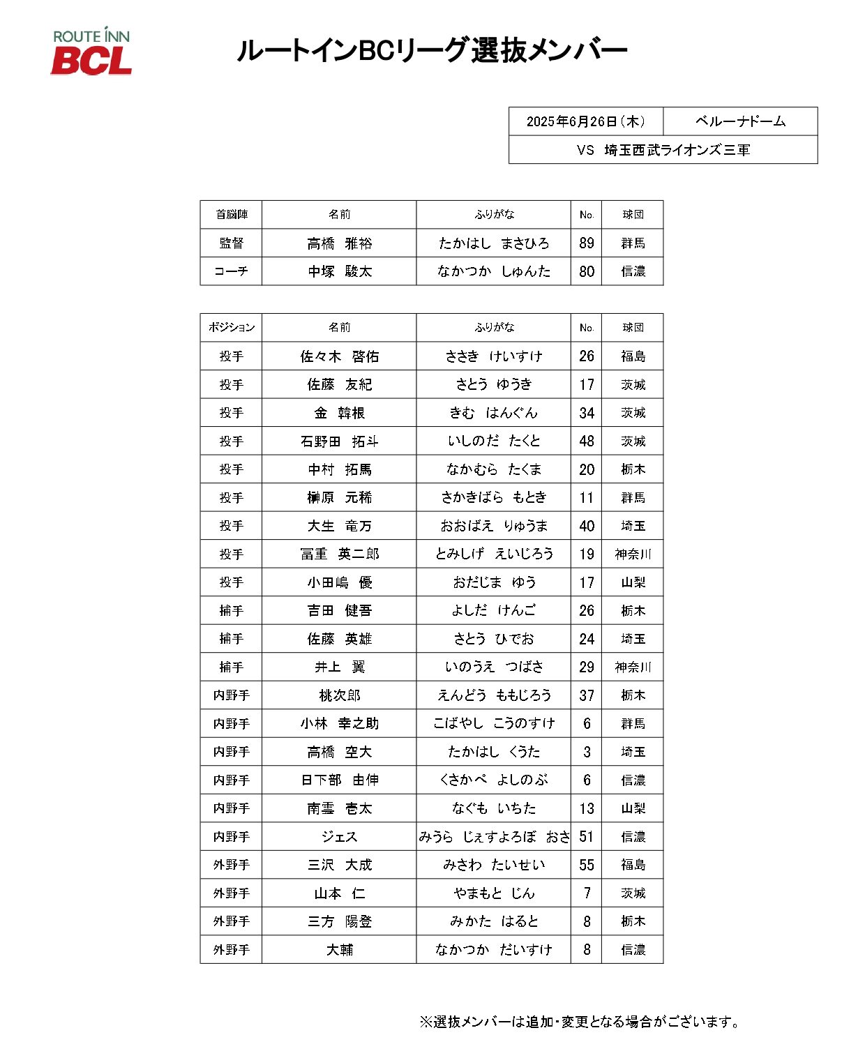 プロ野球独立リーグ・ルートインBCリーグ(Baseball Challenge League)の栃木ゴールデンブレーブスは、6月26日(木)に開催される、ルートインBCリーグ選抜試合の帯同メンバーが決定しましたので、下記の通りお知らせいたします。
