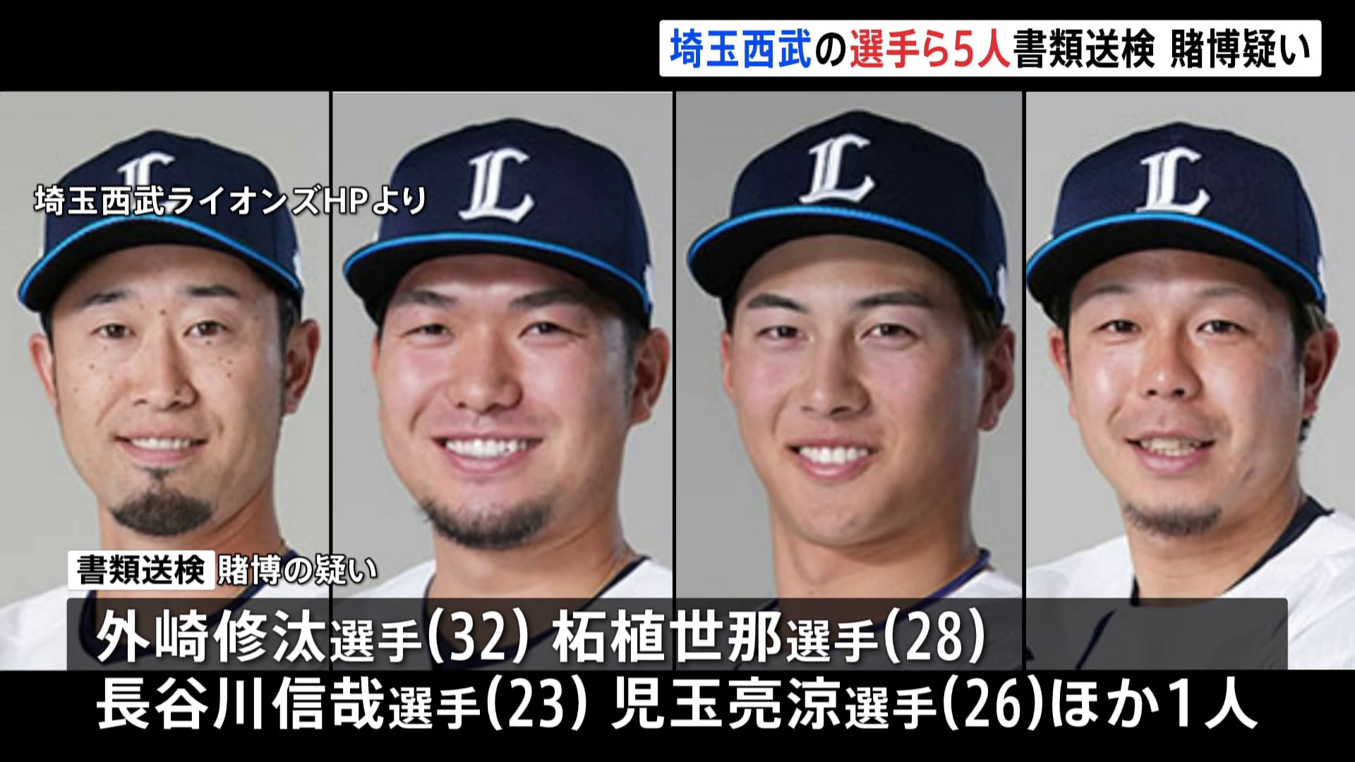 捜査関係者によりますと、きょう、賭博の疑いで書類送検されたのは、埼玉西武ライオンズの外崎修汰選手(32)、柘植世那選手(28)、長谷川信哉選手(23)、児玉亮涼選手(26)と男性職員1人です。