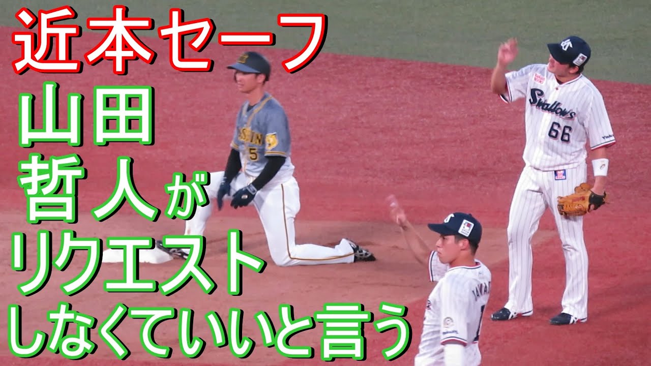 近本が際どい、しかも一瞬2塁ベースから離れたに見えたが、山田哲人と吉田大成は「リクエストしなくていい」と1塁ベンチに合図していました。その山田哲人の合図が「DJ哲人」みたいでかっこいい!