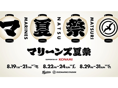 千葉ロッテマリーンズは8月19日(火)~8月21日(木)東北楽天戦、8月22日(金)~8月24日(日)埼玉西武戦、8月29日(金)~8月31日(日)福岡ソフトバンク戦(いずれもZOZOマリンスタジアム)の9日間で「マリーンズ夏祭 supported by KONAMI」を開催することを発表した。
