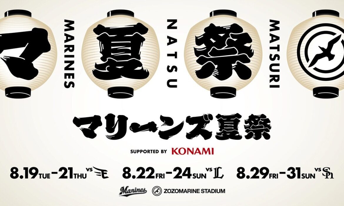 ロッテは20日、8月19日(火)〜8月21日(木)楽天戦、8月22日(金)〜8月24日(日)西武戦、8月29日(金)〜8月31日(日)のソフトバンク戦(いずれもZOZOマリンスタジアム)の9日間で「マリーンズ夏祭 supported by KONAMI」を開催することになったと発表した。