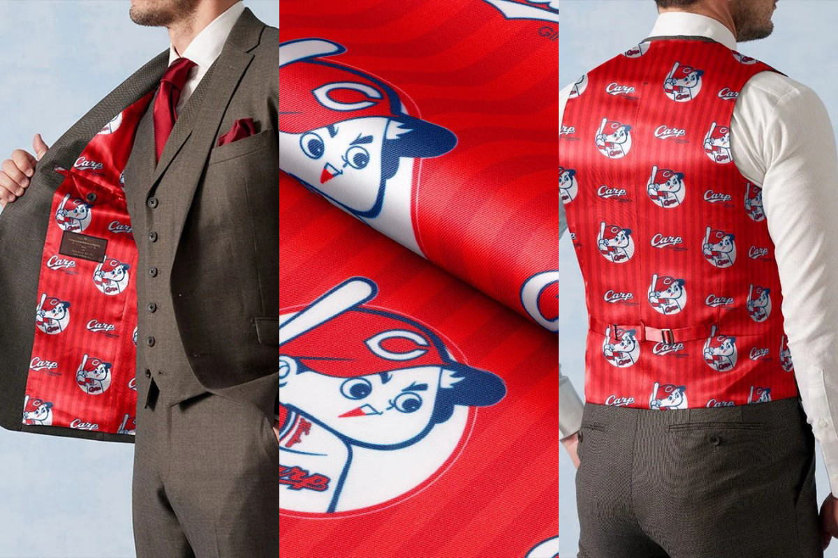 “一見普通のスーツだけど、脱いだら真っ赤なカープ坊やがチラ見え!!” という仕様にもできますし、