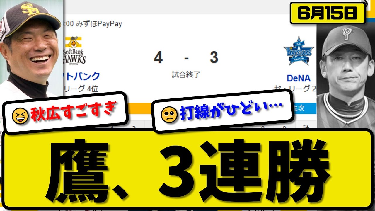 【セ2位vsパ4位】ソフトバンクホークスが横浜ベイスターズに4-3で勝利…6月15日逆転勝ちで3連勝…先発松本5.1回2失点…栗原&秋広が活躍【最新・反応集・なんJ・2ch】プロ野球