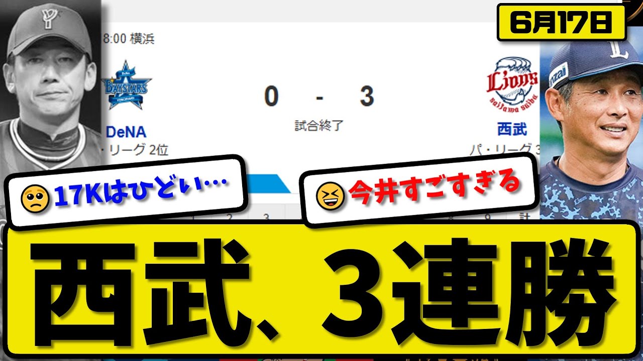 【セ2位vsパ3位】西武ライオンズが横浜ベイスターズに3-0で勝利…6月17日完封勝ちで3連勝…先発今井9回無失点…ネビン&外崎&古賀が活躍【最新・反応集・なんJ・2ch】プロ野球