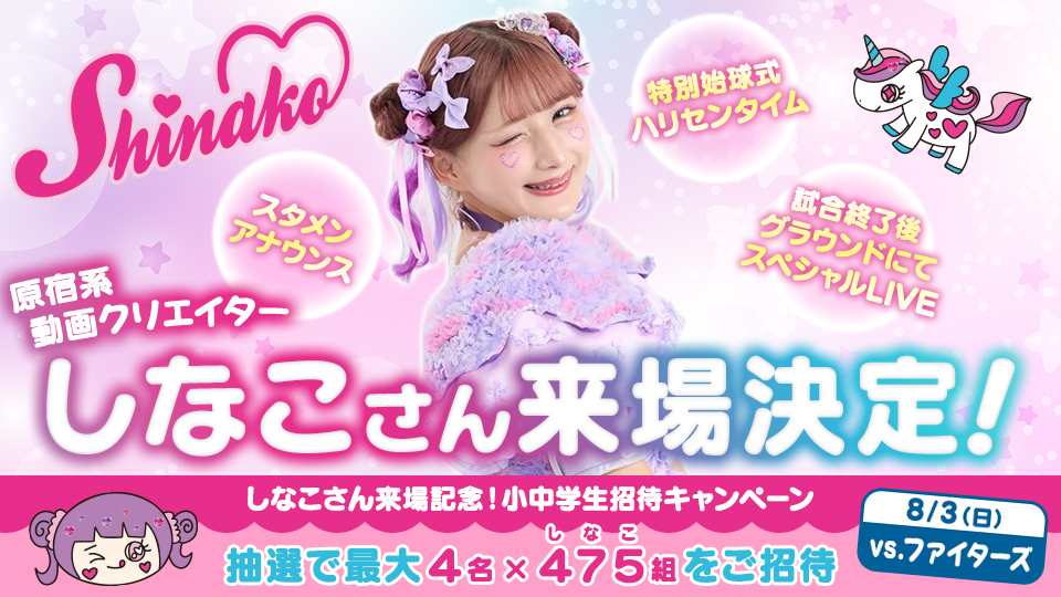 8月3日(日)しなこさん来場決定!【特別始球式やスペシャルLIVEも!】  オリックス・バファローズ【オリックス】原宿系動画クリエイター・しなこが京セラドームに来場 8月3日の日本ハム戦 特別始球式も(スポーツ報知)  Yahoo!ニュース【オリックス】原宿系動画クリエイター・しなこが8・3日本ハム戦に来場 特別始球式など行う  dメニューニュースオリックス、8月3日の日本ハム戦にしなこ来場「精一杯頑張ります」  BASEBALL KING原宿系動画クリエイターの「しなこ」が京セラドームに来場 8月3日オリックス×日本ハム戦で特別始球式  スポニチ Sponichi Annex