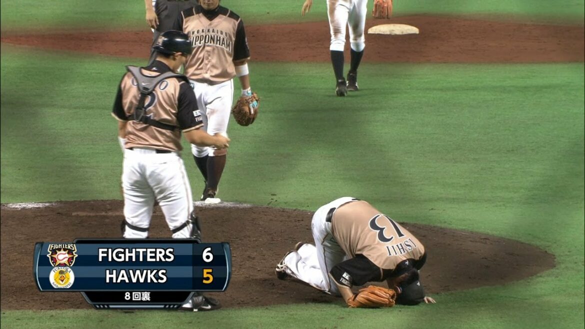 8回、リードしている北海道日本ハムにアクシデント。ペーニャの強烈なピッチャー返しを受けた石井が、マウンド上で倒れ込む。送球もできないほどの衝撃で、担架で運ばれることになってしまった。(2013年9月15日 福岡ソフトバンクホークス対北海道日本ハムファイターズ)