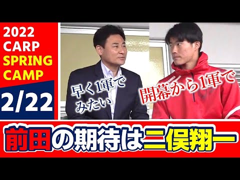 HOMEプロ野球解説の前田智徳さんがカープ沖縄キャンプを視察。インタビュー取材で指名した選手はまだ背番号が3ケタ、19歳の二俣翔一選手。