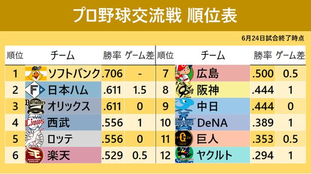 【交流戦順位表】ロッテが巨人に逆転勝利でパ・リーグ全球団勝ち越しが確定 15年ぶりの交流戦上位独占と圧倒的な強さ(日テレNEWS NNN) – Yahoo!ニュース  Yahoo!ニュース【プロ野球結果】交流戦 最後の1試合 ロッテが巨人に逆転勝ち  nhk.or.jp【ロッテ】西川史礁が4試合連続マルチ安打 サブローコーチの助言でフォーム見直し  nikkansports.com巨人・西舘勇陽、まさかの6失点で今季初黒星 悔しさの中で無安打に抑えた「最強世代」には高校時代の“雪辱”も  スポーツ報知交流戦終了、セとパで20勝の開き・・・セ・リーグ勝率歴代ワースト  デイリースポーツ