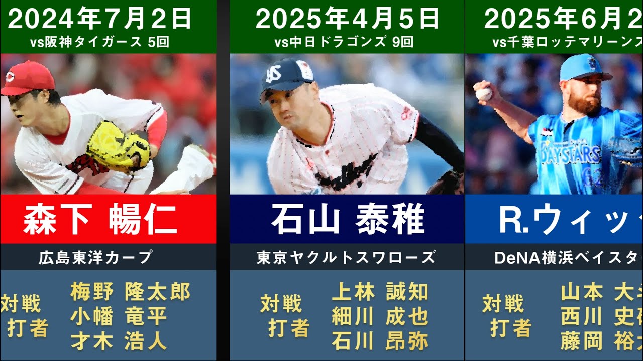 【速報 ウィック投手達成!】プロ野球歴代 三者連続三球三振達成者達成者を並べてみた【石山泰稚 森浦大輔 松井裕樹 モイネロ 武藤祐太 岩田慎司 桟原将司 イマキュレートイニング 森下暢仁】