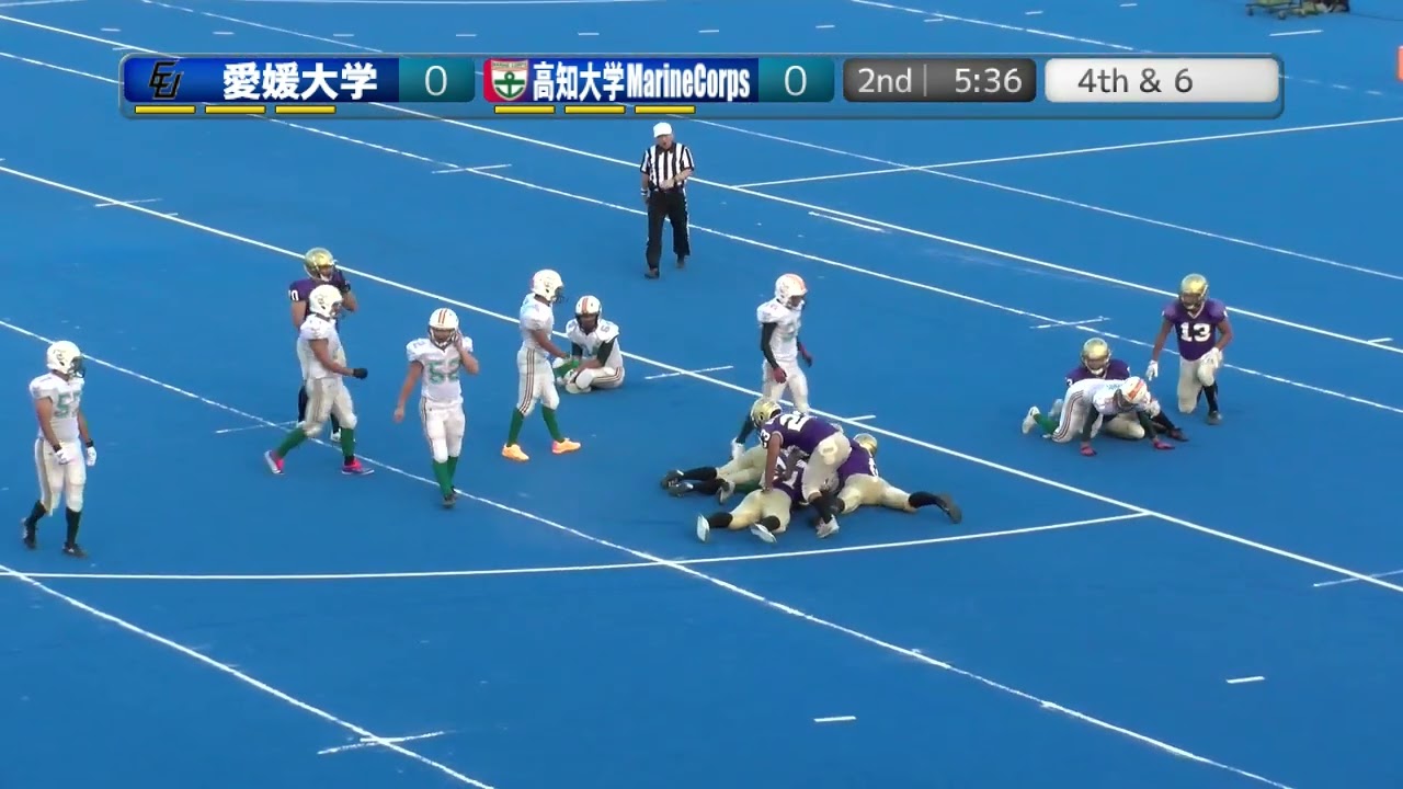 さあこれより第2交代入ります高知大学 サーン3の状況で試合 [拍手] 再開さあパスたしかしパス不 [拍手] 成功学ここでパスプレにより状況打りまし たクターバック構えましては3番ロング パスしかしこれはディフェンスのカバー ありましてパス功となっています結果的に はダンを1つ失フースダウンに変わり ます甲フスタ3フォーメーションを変え パントフォーメーションを取りますパント はキックによる攻撃放棄となるプレイです 攻撃失いますがしかしキック力により状況 高を測りますさあしかしトラブったか [拍手] ここでファントフォーメーションの スナップをラインマンが飛ばした際にその ボールが大きく交代する行一する形になり ましたパンターこれをなんとかリカーし まして蹴りまし蹴り出しましたがえ フォーム崩れた格好ですので大きなキック にはなりませんでしたしかしバウンドよく 結果的には自陣40宿を超えた地点で公衆 交代となりますしかし自陣脱するできこと できず攻撃拳はえ愛媛大学に移ります愛媛 大学相手陣43ヤードカーの攻撃になり ますさあ愛媛大学相手陣43Yから ファースト [拍手] ナイス2 のブロックができましたそのシームをつき まして一気に中央切攻撃拳更新となる見事 ランを決めました媛大学ファス見事なラン を用しましたのは26番の高瀬でした大分 通崎高校出身3回 戦さあこれ以上に愛媛大学は相手陣19 ヤードに入りましてのファースト [拍手] 今度はス見ナイス [拍手] ス今度もランプレにより突破計という ところでラニ枠に託しましたがここで ディフェンスライジが佐藤ラワがその ボールのプレー開始点に迫る前に ディフェンスラインが仕留めましてロス プレイに変えています媛大学ランニング バック28番 山手5yd下がりましてセカンドダウンに 変ります媛 2 セカ愛媛大学セカンドダウン15ボルは 相手陣25 [拍手] [音楽] [拍手] やパス [拍手] 成功さあここで状況火炎とパスを投じまし たクターバック下がりまして左から 入り込んできたバ1番にパス競り合い ながら1番これを見事にキャッチしまして 約7ydの原因と変えてい ますしかし攻撃拳更新には至っていないの でサードに変わり [音楽] [音楽] ますさあは何としてもここを支したい媛 大学は突破なりたいか突破なるか [音楽] [拍手] パス不成功パス不成功ですここで左に展開 したレシーバーに浮かしたパスを通じまし たディフェンスの競り合いにその攻撃突破 を託しましたがしかしここは高踏ん張り ましてフォースダウンに変ります さあ愛媛大学相手陣18ヤードの1の フォースダウン [音楽] 8今度はプレイしますフースダウン ギャンブル8ヤ突破しないと攻撃を失い ますがこのワンプレイにそれをかけ [拍手] [音楽] ますパス 功ここで奥に走り込んだレシーバーにパス をじ一気にタジンを狙わせました ターゲット13番これに飛びつきなんとか 確をみましたがしかしパス届かずパス成功 結果的に4回目の攻撃失敗となりましたの で甲子交代テイクオーバーによりまして 攻撃券変わりまして甲子大学と変わり ますさあ甲子大学自陣18ヤドからの攻撃 になります甲子大学ファーストダウン [拍手] さあこれでコーターバックい た外に展開するレシーバーに投げるかどう かのえ選択となりましたオプションだった 模様ですここではクォーターバック自ら キープを判断しました2度とこれが決まり まして約3ydから4ヤードの原に変わっ ていますまず最初のに非常に頭脳的な判断 しましたのはクォーターバック18番の 和田でした上島東高校出身の2回戦 です学セカンドラウン 6パス不 成功ここでクターバックプレイアクション ラに見せかけてそこからパスをじました 自らの動きをフェイクにする形で奥に 走り込んだレシーバー31番目のパスで トップ測りましたがしかしこれは ディフェンスダブルカバーで阻しまして パス成功サーダウンに変わり ます甲子大学サーダウンシクスボールオン は陣23yd [拍手] ここで中央プレイ た中央突破により状況打を測らとしました がしかし愛媛台ディフェンスフロント 踏ん張りましてこのラウン阻止しフォース ダウンに帰り ます残り 6さあここでえ力を持ってこの状況打測り ましたがそれは愛媛台阻止しましたスダに 大学陣24からのフォースダウンパンプ フォーメーション取り ますここでトラブル 発生パンタスナップを受けましてラント するとこでしたここでボールをジャックし ました結果的に蹴るタイミングを失いまし てプレッシャーからパスによって状況打り まし シバーとするとしかし愛媛大学見事対応し ここでプレ終了です結果的に陣を脱す陣地 挽回図ることはできず州交代です愛媛大学 非常に有利な位置で攻撃をえましたここで えタイムアウトが入り ます高知大学が前半1回目のタイムアウト を取りまし [音楽] たアメリカンフットボールは 後半3回ずつタイムアウトを取ることが できますまず先ほどえミスをしました高内 大学がえ今の状況を立直さんとここで作戦 タイムを取りまし た大井様