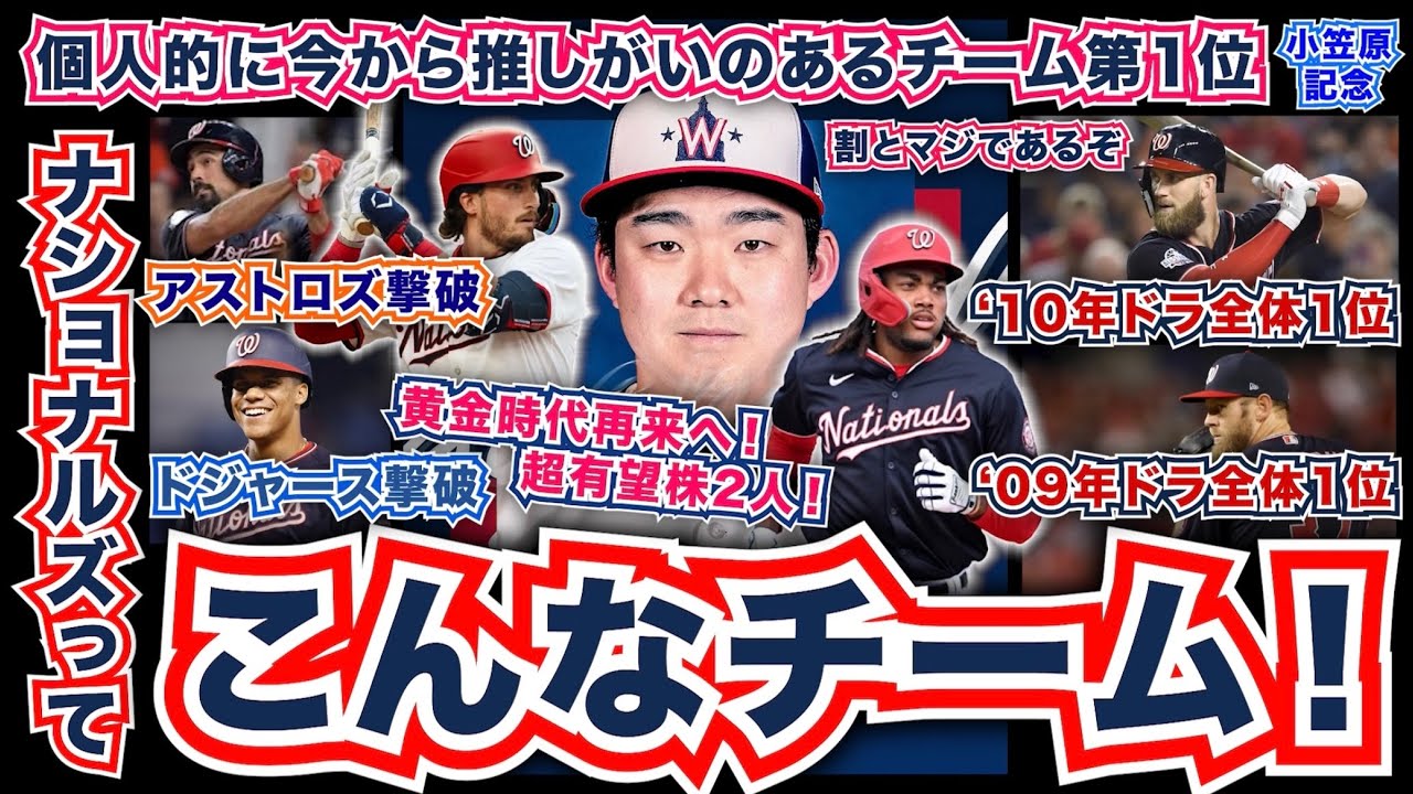 さあ始まりましたMLBパークジャパン司 の酒井ですどうぞよろしく本日のテーマ ですね小笠原が遺跡個人的に今からおしい のあるチーム第1位ナショナルズって こんな チームめちゃくちゃおすめありがとう ございます小笠原新之助がワシントン ナショナルズと2年350万ドルで5位 ナショナルズではほぼ初の日本人選手が 誕生しましたてなわけで全然日本人には 馴染みがないそうなので実はナッツを結構 押している私酒井が今回ナショナルズの 魅力をゴリゴリにお伝えしますはいてな わけで小笠原決まったんすね昨日決まって いたらしいんですが私はスノボやってたん ですけど左肩負傷して15日間のに入り ますヤシは15日間ないって言われたん ですがなるほどねはいで話を戻して ワシントンナショナルズの解説をします いや良かったね小笠原ナツかっていうね あの青柳選手のフィリーズマイナー契約 ってのもあってナリーグ東地区に日本人 選手が絡み始めたからこれはなかなか 楽しくなってきましたねナッツの基本情報 見ていきましょう196019年に モントリオールエクスポズとして創設され たのがワシントンナショナルズです モントリオールはカナダの町ですね今は カナダの町に本拠地を置いているのは トロントブルージェーズだけなんですが かつてはトロント以外にもモントリオール にチームがありましたで1981年に エクスポズは初めてポストシーズンに進出 しますただこの年は7月ぐらいに3週間 ぐらいストライキがあったんだよねで 1994年にも地区周囲に立っていたん ですがこの年にもストライキが起こっ ちゃってえでこの年の場合はストライキの ままワールドシリーズすらも開催され なかったって年だからなんと モントリオールエクスポズは地優勝する ことなくチーム名が変わっちゃったそんな チームなんですね近鉄に似てるんだよな 近鉄も日本一になれなくて2004年を 最後に2005年からえなくなっちゃった んですけどエクスポズの場合は2005年 からナショナルズに名前が変わったんです ねえそんなモントリオールエクスポズ時代 の主な選手をちらっと紹介しておき ましょうラリーウォーカーは89年から 94年にかけて在籍していましたラリー ウォーカーといえば90年代後半から 2000年前半のあのブレイクストリート ボンバーズロッキーズの第大大中心の選手 なんですがえ元々はXPSの選手でした 同じような感じなのがペドロマルティネス ですねペドロマルティネスも94年から 97年にかけてエクスポズで経験を積んで 98年からはレッドソックスの最強の ピッチャーとして君臨しましたえ次が ブラディミールゲレーロですね ブラディミールゲレーロジュニアの お父さんま通称パパゲレーロですけどパパ ゲレーロも年から2003年の間 エクスポズに在籍していましたエクスポズ の時から5ツール系の選手として知られて いて2004年からはエンゼルスに移籍し ましたよねであとは日本人選手ですイブ 秀樹吉井正大花友和の3人が2000年 2001年2002年頃に同時に在籍して いました3人が揃ったのは2001年だけ なんですけどこれ結構すごいことですよね 今のロジャースに大谷と山本と佐々木が いるんだけどいやいやいやいやと先は エクスポズだよってことですよエクスポズ が先に日本人選手を3人揃えていたんです よねで2005年からはワシントンDCの 方に移転しましてチーム名も変わったって いうのがエクスポズの歴史でしたそして ワシントンナショナルズになって2019 年ですね球団初のワールドシリーズ制覇を 成し遂げたというのが基本情報ですさあ そんなナショナルズになってから近年の 動きをざっと振り返ってみますえ2005 年ができた年ですねま楽天と同い年だから 近鉄楽天と本当によく似てるんですよねえ 2005年のドラフト全体4位でライアン ジマーマンという選手が入団しましたえ このライアンジマーマンはオールスターズ 選出が2回シルバースラッカー賞が2回 ゴールド1回っていう選手に成長したん ですよねナショナルズ市場に残る名選手に なりましたドラフト一期制だしその後 ずっとナッツで頑張ってもう引退しちゃっ たのかないや非常に印象に残るそんな選手 でしたで2009年のドラフト全体1位で はピッチャーのスティーブン ストラスバーグを獲得しましたこの スティーブンストラスバーグがアマチュア 史上最高のピッチャーって言われてるんだ よねスティーブン ストラスバーグ以来の大物だって言われた のが昨年のドラフトのポールスキンズ今 パイレーツいますけどポールスキンズか スティーブンストラスバーグかゲリット コールっていうこの3人がドラフトの時点 でとんでもない評価を受けていたっていう 3人ですねで2020年からは ストラスバーグ7年2億4500万ドルの 契約でナショナルズと再契約したんですが ま後で話すんですが2019年のワールド シリーズ制覇を最後に完全に力尽きて しまいまして怪我との戦いが始まりえ去年 ね完全に引退したのかなっていう ピッチャーでしたほんで翌2010年には ドラフト全体1