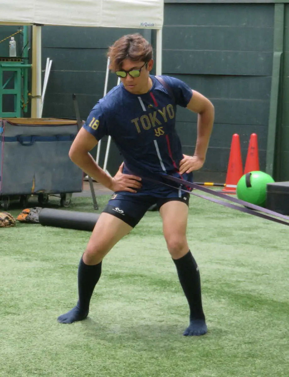 チューブを使ったトレーニングを行うヤクルト・奥川