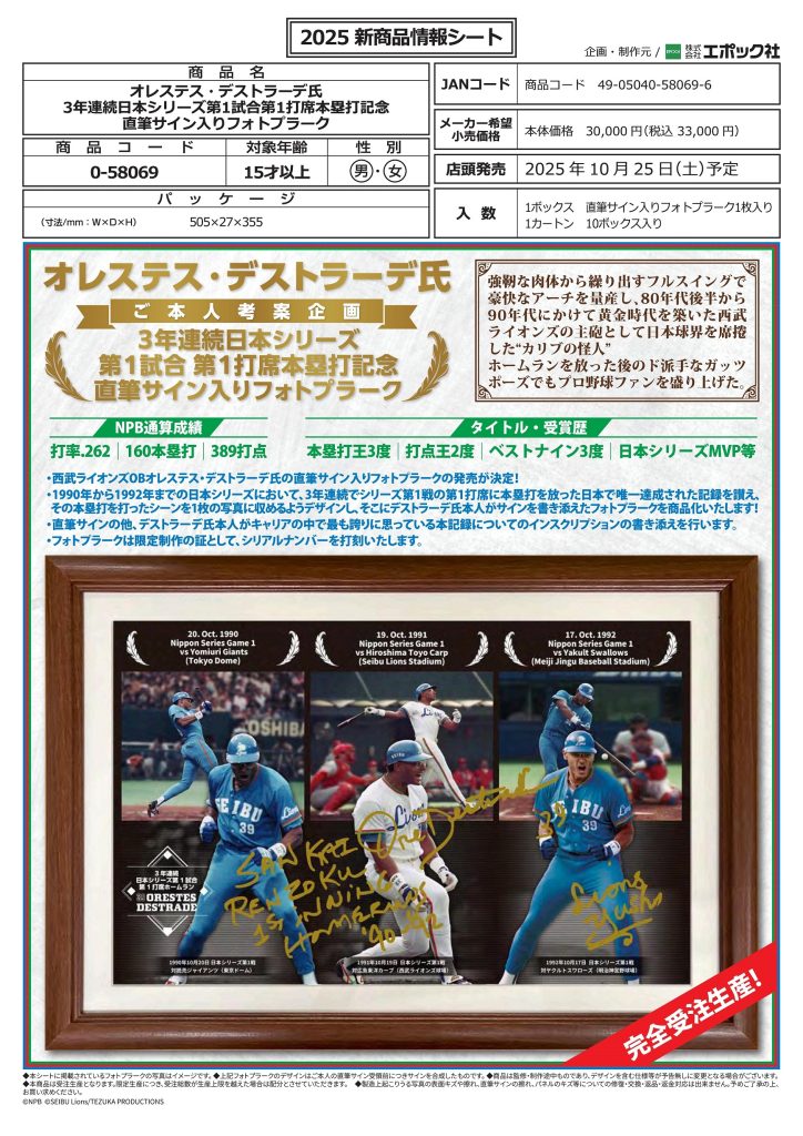 1990年から1992年までの日本シリーズにおいて、3年連続でシリーズ第1戦の第1打席に本塁打を放った日本で唯一達成された記録を讃え、その本塁打を打ったシーンを1枚の写真に収めるようデザインし、そこにデストラーデ氏本人がサインを書き添えたフォトプラークを商品化いたします!