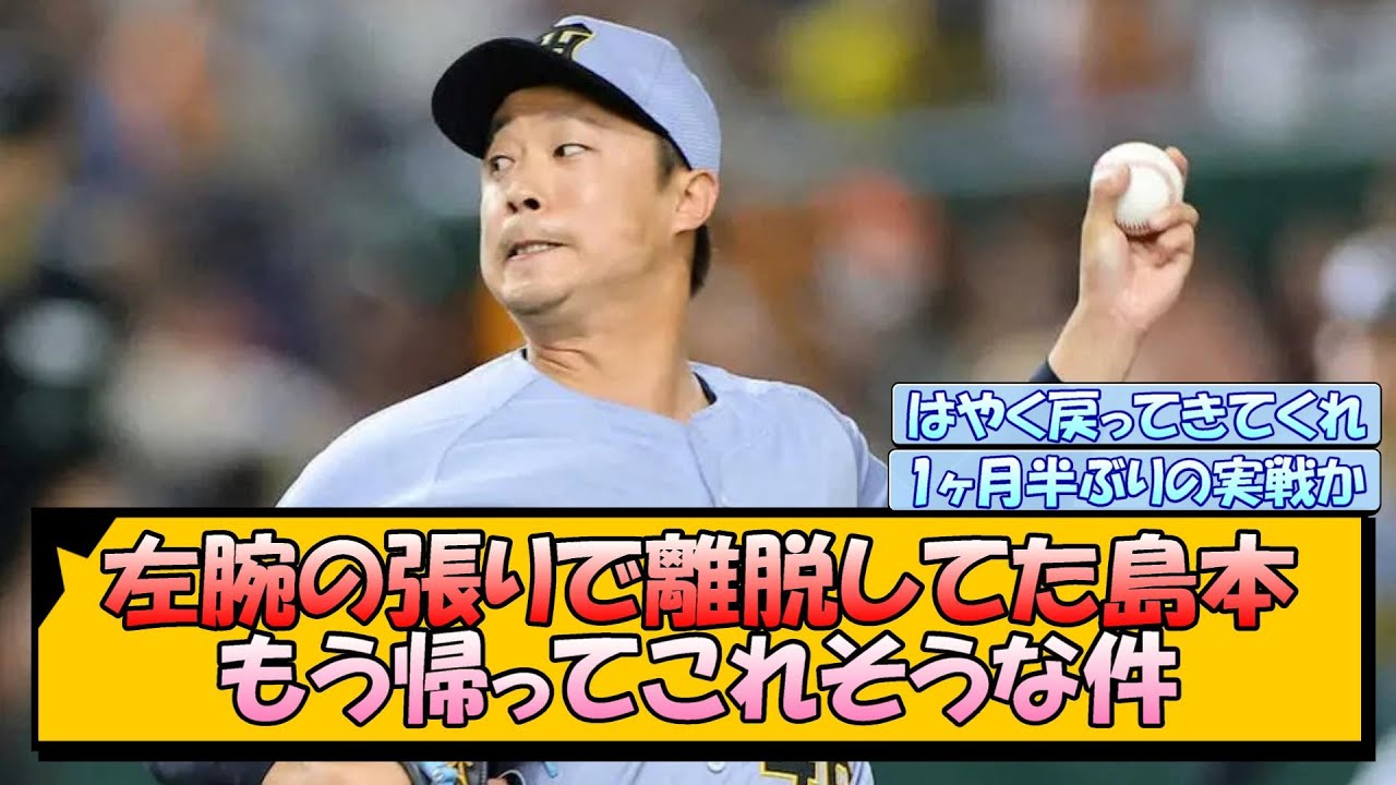 [音楽] 阪神サワの針で離脱してた島本もう帰ってこれそうな剣 [音楽] リリーフを充実させるには負傷離脱してた人たちが戻ってくるのが 1番やろ 石黒とかはどうなんやろか島本は昨日投げて良さそうな感じやった [音楽] 実践は5月の一軍巨人戦以来だから 1ヶ月半ぶりか [音楽] 良さそうな感じだったけど本人評価では切れがまだまだだったみたいやね [音楽] 島本って地味だけど本調子になればめちゃ助かるんよな ビハインドにワンポイント延長でもある程度信用できる 今期も1軍で8試合に登板して防御率 1.17 こういう中堅がリリーフ支えるのは優勝に向けて必須条件よね 夏場の苦しい時に戻ってきてくれるとありがたいね [音楽] これからも何の面白いすれを取り上げて いくのでコメントチャンネル登録高評価 よろしくお願いします [音楽]