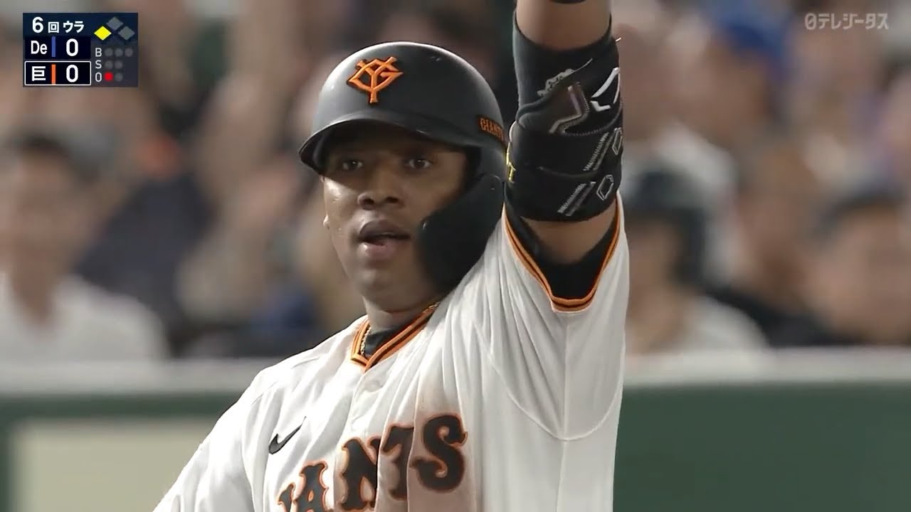 ここまでベイスターズがヒット2本 ジャイアンツはヒット1本というここまで になっています ストレートうまく打ち返してセンターの前 155kmのボールをおが打ち返しまして 2アウトランナー1塁です ジャイアンツとしては今日2本目のヒット 番ショト口 これもインコースでしたがお声がうまく打ち返しましたね 詰まりながらですけどもねいいヒットですね ええ ご覧の表情K です強く叩いてセンター方向打球伸びる伸びてどうかペンスに当たりましたさあ頂になる声が [拍手] 2塁ベースを蹴る3塁は向かってヘッド スライディングスワン アウトランナーなしからセンターオーバー のスリーベーヒット [拍手] いやこれも高橋さんものすごい音がしましたけれども [拍手] ねよくね上から叩いたというかその前のボールもね同じようなねまスライダーカット系だったですけど結構上から叩きに行ったんですけども今度はねちょっと高め来た分ね余計ねその起動にあったというかね [拍手] えもう 1 度外強いボールできてレフト声がベースにつく 取ってスタートを切るホームへ向かって タッチはできない先制はジャイアンツ 声の3ベースから 伊口の犠牲フライ声もよくホームまで 突っ込んできました [拍手] ついにこの中盤でゲームが動きました [拍手] ま今のフライもそれほどま深いというわけではなかったかもしれませんが そうでもないですけどもね [拍手] [音楽]