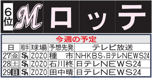 【ロッテ】先週のMVP&今週の展望 新守護神誕生!!中森俊介に注目 nikkansports.com【ロッテ】先週のMVP&今週の展望 新守護神誕生!!中森俊介に注目(日刊スポーツ) Yahoo!ニュースロッテの若き新守護神はロマンチスト 中森俊介のコメントには味がある 現在8試合連続無失点中 サンスポロッテ・岡大海「若い選手には思い切ってやってもらいたい」、「プレーでしっかり活躍したい」20代の若手の台頭が目立つ中でさすがの存在感 BASEBALL KINGロッテ、若手野手たちの覚悟 藤原「若い人間が力を出さないと優勝できない」、山本「若い人たちが活躍したら勢いがつく」、池田「負けないようにやっています」(ベースボールキング) Yahoo!ニュース