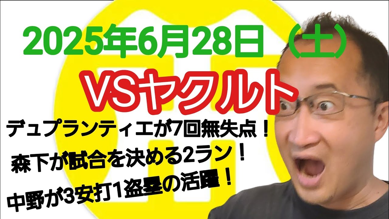 【阪神タイガースについて語る動画】2025年6月28日(土) ● ヤクルト 0 × 2 阪神 ○ デュプランティエが7回無失点! 森下が試合を決める2ラン! 中野が3安打1盗塁の活躍!
