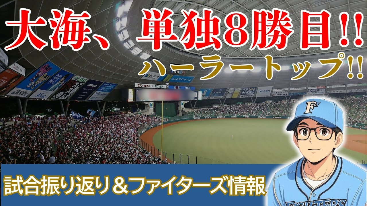 皆さんこんにちはこんばんはみやっちです 久しぶりにねあのリーグ再開ということで ですねま今日楽しみに5日ぶりのリーグ戦 ということでねちょっと見てたんですけど もで今週ニュース飛び込んできましたよね うん ファイターズ入本拠地を北海道へということでま今のところの方針でいいくと 2030年頃っていう ことらしいんですけどもまその一致に向けては今 3 つ補があるんですよねま北海道の恵別市庭瀬歳 市がまあ一に向けてこから動くんではないかということですねなってました ということでまあの話を切り替えて試合を 振り返えていきたいと思うんですけども えっと今日のファイターズのオーダーなん ですけども2番レフトタミアということで 久しぶりにレフトを守ったんですよね今日 タミアがねでこれがどうのかななんで だろうと思いながらですね僕ちょっと見 てったんですよということで試合の流れ 行くんですけどもまずですね2階の裏ま 山村の打った打球ショートのたくちゃんが ですねゴロエラーしてしまって1対0と 先制を許してしまうんですよでその後3回 にも今度は渡辺に左中間へのソロホーム ランを打たれもう1点追加されるというの が3回までの流れだったんですよねで今度 4回表反撃に入れますまずタミアが宇宙栄 ソロホームランこれで2対1と1点 追い上げますと追い上げムードの矢先なん と真んの打席ワンストライク2ボールの後 急にですねが座ってしまったんですよでま どうやら熱中症になっただろう 崩しで急遽マウンドを降り山田に変わった んですよでここから流れが変わりましてえ 2者連続ファーボールたくちゃんが 押し出しファーボールを選んで2対2の 童貞になるというまさかの展開で4回まで 進んだわけなんですよねでその後7回まで 0更新両チーム広いはライオンズであれば 中継陣が7回まで0で行ったんですけども 8回になんと真波がライトオーバーの2 ベースヒットでこれで2点追加さらに山形 がセンターへの犠牲フライで1点追加し これで3点リードの5対2になりました そして最終回は柳川が3者凡体で抑えて くれてゲームセットということで勝つこと ができましたいやあ本当にねリーグ再開の 初戦王をねまず取れたっていうことは本当 に良かったんではないかなという風に感じ ましたということでは投手人今日の投手人 振り返えていきますけどもまずは先発した 広みですねを勝ったことで8勝目ハーラー トップということになりましたいやあ 良かったですねうん8回127912 脱三振2失点ということでねうん本当に 虫暑い ベルーナドームを考えるとよく127級 投げたなっていう風にそこをまず褒めたい なと思いましたねでま広みに関して ちょっと上げてくと序盤はコントロールが 甘く打たれる場面が多かったんですよね うんそういうところもありえ渡辺にホーム ランを許しちゃってところもあったんです けども4回以降はどの急所もキれがあり コントロールが良くなりそのおかげで三振 も増えてきたっていうところでの結果12 だったんですよねというところを考えると 本当に良かったなという風に感じましたで また柳川ですけどもえ9回にマウンドに 上がりまして今振り返りも話した通りえ わずか10球で3者凡体で抑えたことに よって3セーブ目という形になりましたね 今日も柳川ストレート綺麗ありましたね 良かったです本当にねまあの無失点でゼロ に抑えられたっていうのは本当に良かった んではないかなという風に当人は感じまし たでえ広みの試合後のコメントがあります んでえー紹介していきたいと思いますなん とか粘り強く投げることができた先制点を 与えてしまったが長いイニングを投げられ てよかったと知り上がりにコントロールも 良くなったと思うということで話されて ましたね本当に試合中のコメントでも僕 振り返りでも話しましたけどもよく熱中症 っていうか虫暑い中ねうん1279本当に ありがとうございましたっていうとこで 感じましたはい次野人行きますけどもまず はなんと言っても今日のホームランタヤが 追い上げの1発ということで3号ソロを 打ってくれましたよね宇宙間にいやあ本当 にたやありがとうとこれを川切りに逆転撃 が始まったと言っても過護ではないかなと 思いましたでこれを含むもう1本ヒットを 打ったのでタヤはマルチアンだということ になりましたねということで次他の主人を ちょっと見てくんですけども 矢沢もマルチヒット12番がね今日はね ルイに出てくれたおかげで特定に繋がった んだなていう風には感じましたねでそして と78回だごめんなさい近いに真ん中が タイムリー2ベースヒット2点タイムリー 打ってくれましたねうん1打席目から3 打席目までなかなかヒットが出なかったの で今日はどうなんだろうっていう風に一瞬 心配になりかけたんですけどもねなんとか 打ってくれましたそして次は山形普段で あれば守備なんですけども今日は バッティングで見せてくれりましたね犠牲 フライを打ってくれたということでもう こ