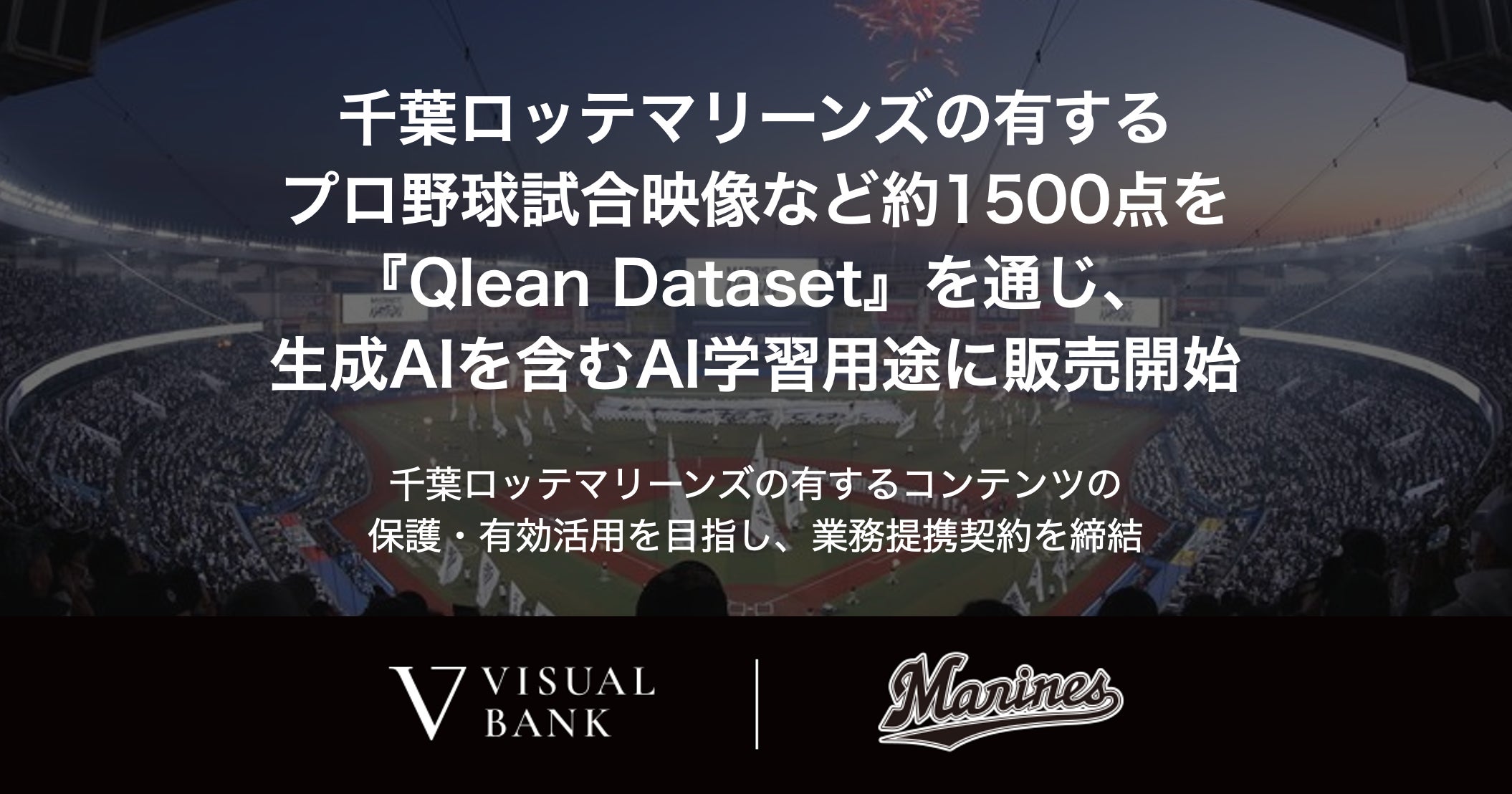 ■Visual Bankグループ 株式会社アマナイメージズ 代表取締役CEO 望月 逸平 日本として、世の中に存在する貴重なクローズド・データをいかに活用していくかが課題になっています。この度業務提携契約を結んだ千葉ロッテマリーンズ様の有する貴重な素材を「Qlean Dataset」を通じてAI開発現場に届けることで、新たなテクノロジーやユースケースが創出される一助になることを目指します。Visual Bankグループは、今後も適切な権利処理・用途管理・対価還元のもと、クローズド・データのAI学習用での社会での利活用を推進し、安心・安全なAI開発を裏側から支援していきます。