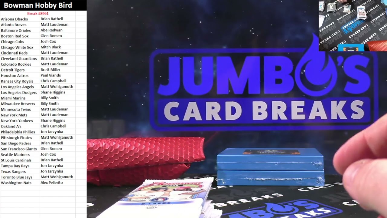 good luck here guys The Bowman Hobby Bird 8961 Dice roll three times Going one two and three And three here Three here Red Sox up top The Rangers at the bottom And three times on your names We’re going one two and three again Glenn up top John Jarsa at the bottom And let’s sort them out 8961 And there’s your teams Good luck everybody Let’s rip [Applause] Blake Mitchell Perilla Mate and Freeman We have a Leo reptilian of Johnston Nixon Garcia for Boston Franklin Arius Jacob Wilson Christian Moore we have Jefferson Quero George Clen and Carlos Tavvarz Cam Smith Christian Moore Owen Wild on the X Fractor Jen Pink Paper Ben Rice rookie to 175 New York Yankees on the rook a Young Chan Um for Kansas City on the autograph Chris Campbell Leo de Breeze to 150 Padres’s we have Purdomo Chase Lauder David Ortiz Jr insert of Kaden Dana Malcolm Moore JJ Weatherholtz Jack Hagen Smith Alberto Cruz Yafrey Blake Walters Sunstrom Senria Hagen Smith Chen Wein Echavaria Brett Louder Dylan Fen Ryan Clifford Hagen Smith Connor Griffin We got D’Angelo Ortiz 125 on the TLX fracture for the Boston Red Sox D’Angelo Carson Benz Joe sorry Cole Fontineel Mini Diamond for the Angels Travis Bazana John Keny Shoi Yafery Chase Mobley Drew Romo James Wood and Jing can recap here D’Angelo to 125 Leo to 150 um on the auto Ben Rice 175 Johnston Nixon on the reptilian We got to ramp off this base paper Add 25 more bucks Super fract paper here guys in this break Dice roll and we’re going seven times We’re actually going to do this twice because I forgot to do it for the last break So obviously the first one no confusion here First one right here is going to be for this break 8961 And then we’ll stop the recording and we’ll do the random for 8960 the base paper because I forgot to do it seven times We are going one two three four five six and seven Again the Toronto Blue Jays here and Matt Wamoo taking down the base paper Seven there seven there