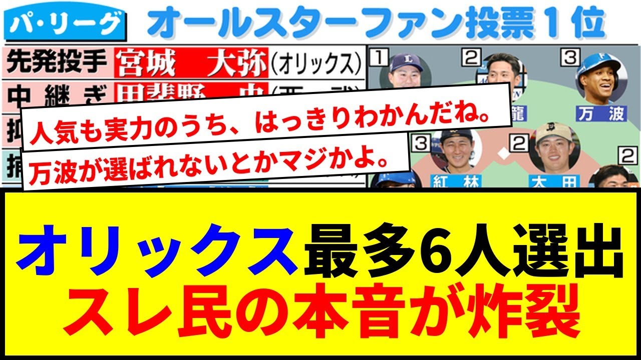 オリックスサイダー6人出 の本音が炸裂本旧気校がマイナビオールスターゲーム 2024 の半島表最終結果を発表しオリックスが両リーグさ [音楽] 6 人の選出となりました西武からは新人の渡吉渡が外し部門で選出されるという解を成し遂げていますその一方でロッテハム楽天の 3 球団からはファでの選出者がおらず団間で迷案が若える結果となりました選手国の人気やチームの勢いが色国く反映されたこの結果は多くのファンの間で話題を呼んでいます [音楽] から4 人とか当然の結果山下もいたかったな 中島マジックで戦士が輝いてる証拠育成力も本物だわ どうせハムは選手投票で大量選出されるんだろ W 胸もれ林も選ばれて最高や軍宮頑張って欲しかったのひじり分かるこれはライオンズだ頑張ったな打率 [音楽] 220 で選ばれるのは期待の現れ守備総類は一級品 救援で何かやらかしてくれそう一発正に期待したい W 現がない中をテプくのはチームとして大きい 楽天すぎだろ朝村くらいは入れてやれよ [音楽] マンパが選ばれないと神よ組織表には勝てんかロッテは突出したスターがいないのが響いたなチーム欲のに [音楽] 結局チームの勢いとファンの熱量が正直に出るようなこれだと人気も実力のうちはっきりはわかんだね [音楽]