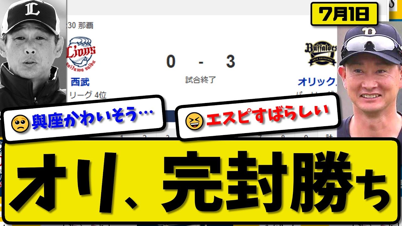 【パ2位vs4位】オリックスバファローズが西武ライオンズに3-0で勝利…7月1日完封勝ち…先発エスピノーザ6.1回無失点…西野&中川&来田が活躍【最新・反応集・なんJ・2ch】プロ野球