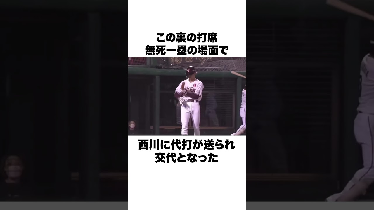 実はこのプレイ何でもないに見えるが彼の 野球人生を180°変えるプレーとなる 問題の場面は対戦相手の6手20対0と 大佐で負けている5回を持て岡が打った 打球が西川の守るレフトの頭を超えたが 西川はゆっくり打球を追いかけゆっくり 研究したため3塁だと成地出したのに セーフライで1点を失ったこの裏の打無1 類の場面で西川2代打が送られ交代となっ たこの交代について監督代行を務めた牧シ ヘッドコーチはあんな追い方されると見 てる方も気分悪くなるので買えましたと 語った西川のタイマプレイは日ハム時代 からで西川が1塁ランナーだった時に杉也 が送りバントを成功させるも西川は スライディングをせずアウトになったり1 塁の場面で面倒さがレフトフライに 打ち取ってもアウトカウントを間違えて キャッチしたボールをスタンドに投げ込み テイク2ベースにしたこともあるこうした タイマンプレイの数々により日ハムを追放 された西川だが楽天でもその悪癖は治って おらず楽天も首になっ