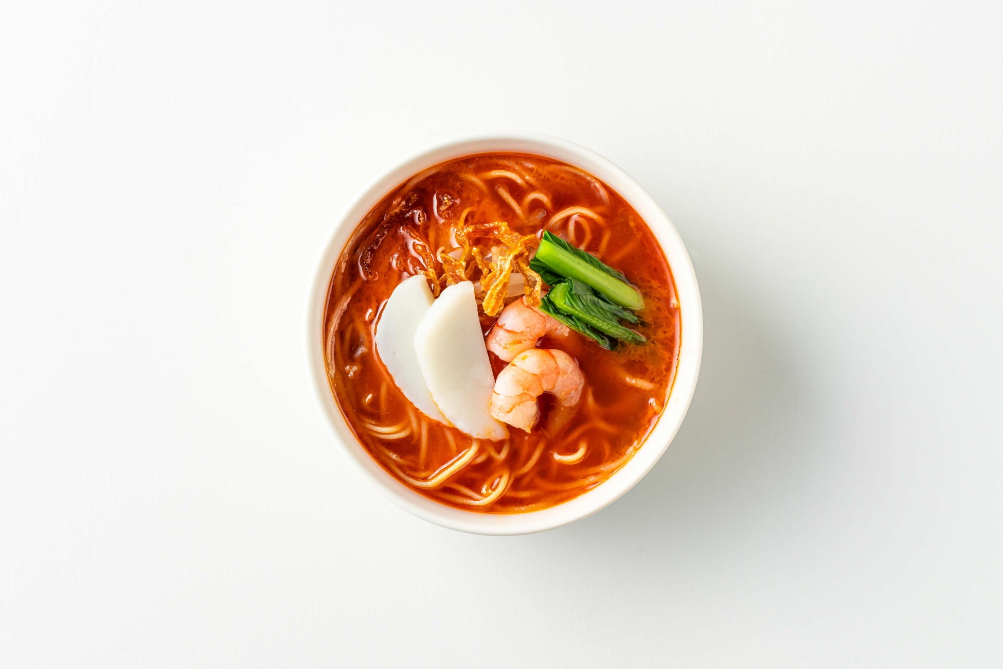 豚肉と海老頭からとった伝統的な出汁をベースにした、豊かな味わいのスープが特徴の麺料理です。トッピングとして、かまぼこ、ほうれん草、エビがのっています。