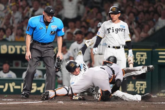 プロらしい紙一重の攻防。球審の判定はアウトとなり、甲子園は悲鳴が起きたが、すぐさま藤川球児監督がリクエスト。数分の中断を経て、セーフに判定が覆り、聖地は大歓声が包まれた。一方で判定に納得ができなかったのか、阿部慎之助監督がベンチを飛び出して抗議。その後、退場処分が下された。