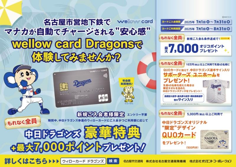 名古屋市営地下鉄マナカにオートチャージができるクレジットカード「wellow card Dragons(ウィローカード ドラゴンズ)」の3周年を記念し、中日ドラゴンズファンの皆さまのために、通常は手に入らない「サイン入りサポーターズユニホーム、オリジナルデザインクオカード」プレゼントキャンペーンを実施いたします。