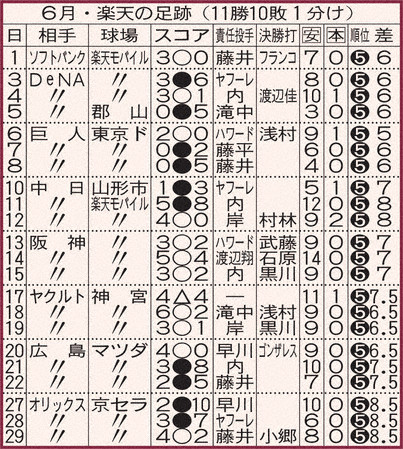 楽天は6月を1つ勝ち越しました。頑張ったと思います。