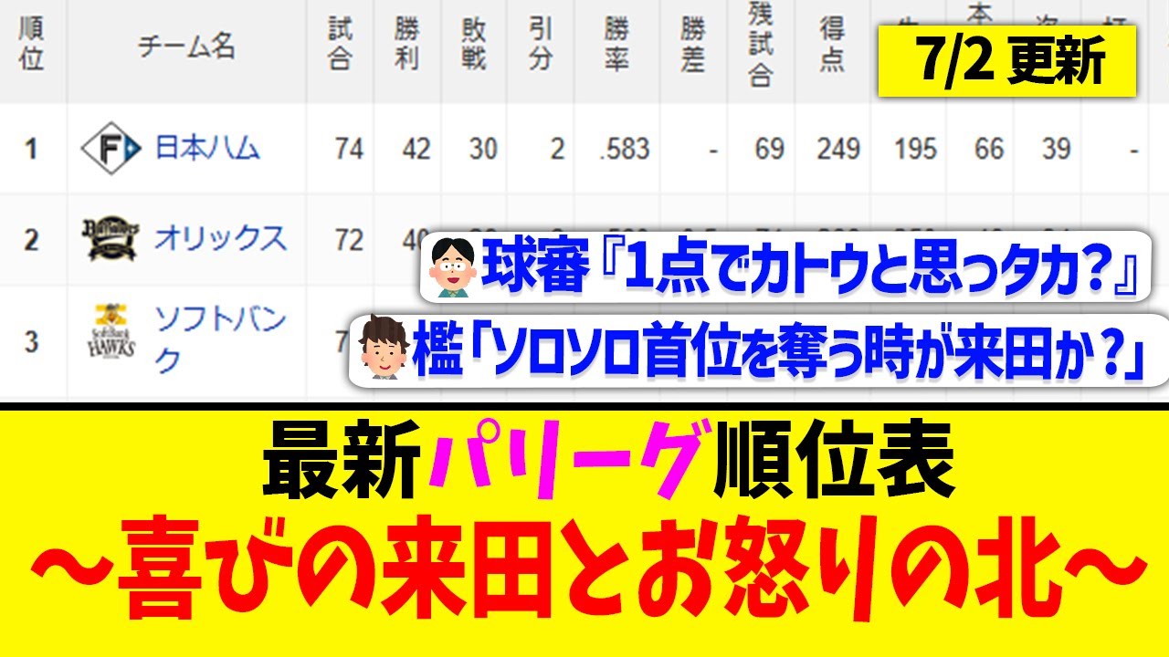 【7月2日】最新パリーグ順位表 〜喜びの来田とお怒りの北〜