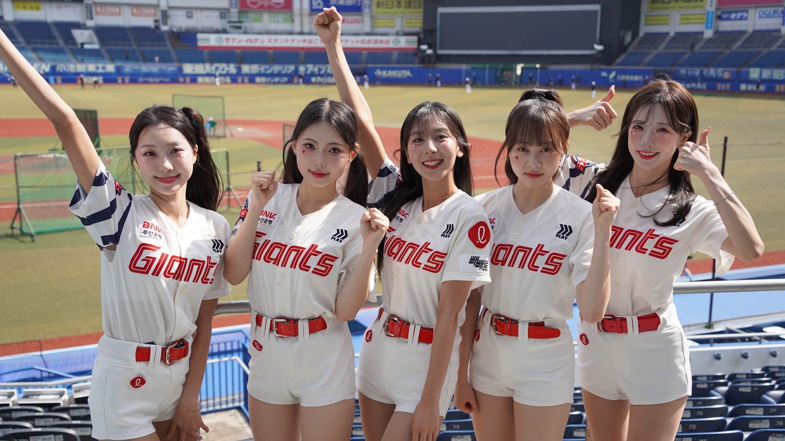 The Lotte Giants cheer team has 13 members in Korea. We will introduce the five members who visited us this time: leader Mok Na-kyung, Lee Ho-jeong, Park Dan-bi, Kim Na-hyun, and Kim Ga-hyun, along with their messages to Japanese professional baseball fans.