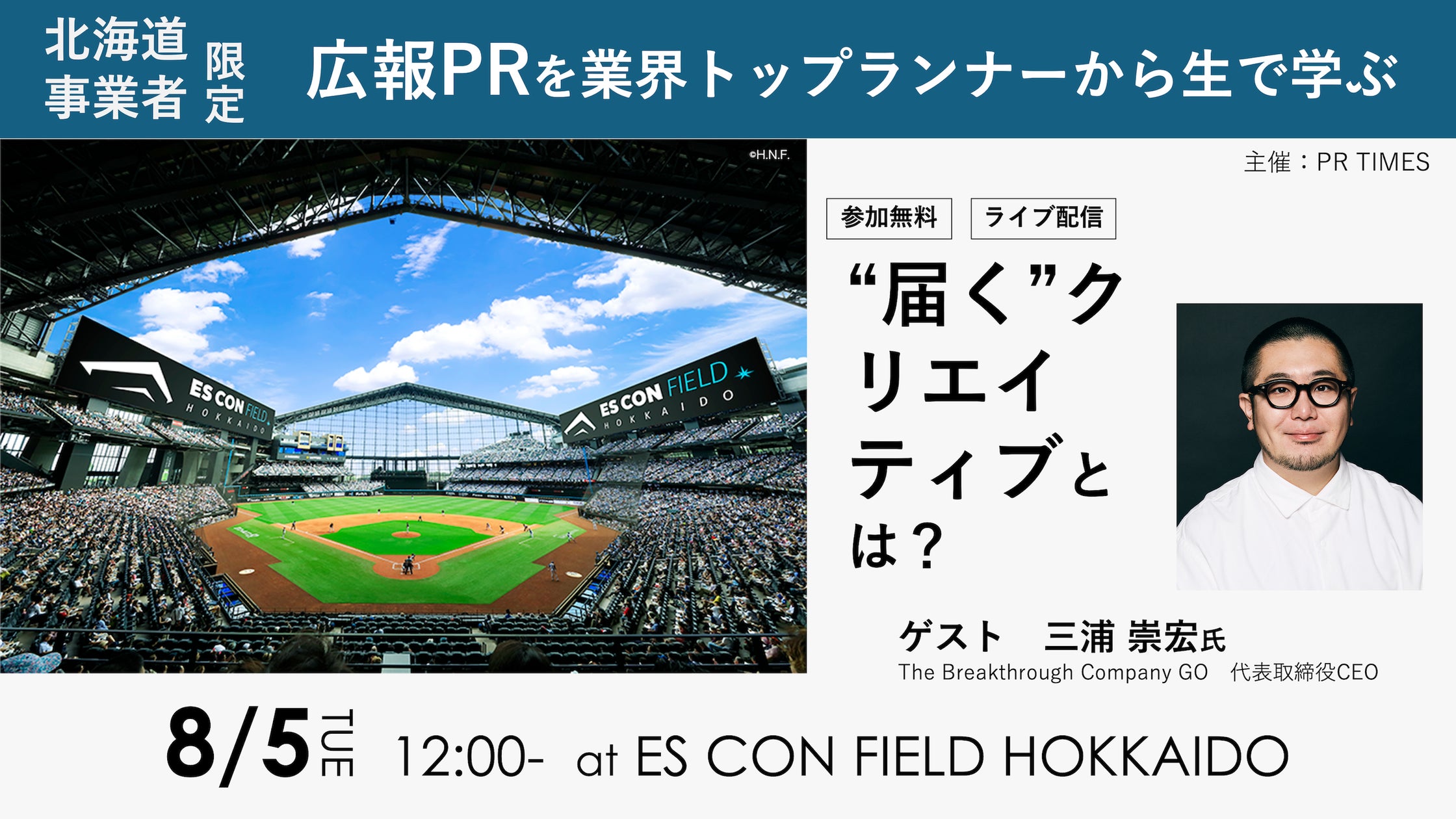 そしてセミナー終了後には「バッターズアイラウンジ by PR TIMES」で試合を観戦しながら、参加者同士の交流会を実施します。参加者同士で一緒に地元のチームを応援しながら、地域の経済を盛り上げていく地元事業者の仲間を作る場を目指します。地元を大切にして地元から愛されるチームだからこそ、北海道日本ハムファイターズを一緒に応援する中だからこそ生まれる交流に期待しています。交流会の冒頭にはゲストの三浦氏にもご参加いただきます。