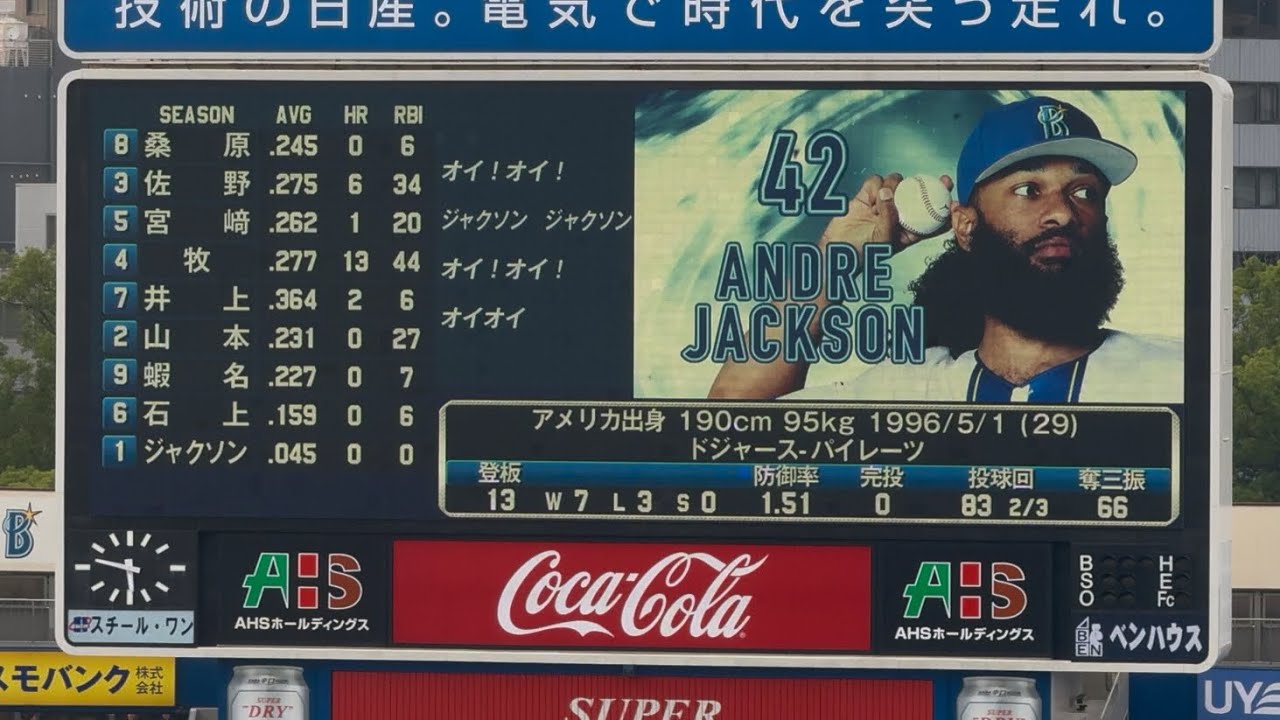 ここ横浜レスリーライン 1番センター背番号1桑原正幸 [拍手] [音楽] [拍手] 番ファース背番号 佐野太背番号 [音楽] 51 宮崎Go! [音楽] [音楽] [音楽] 5番レフト背番号 50号 井上 [音楽] 6番キャッチャー背番号 山本優 7番背番号 エミ老達夫 [音楽] 番号44 大 [音楽] 9番ピッチャー。 背番号42 アンドレ [拍手] [音楽] 前 [音楽] [音楽] [拍手] はい。 [拍手] [拍手] 皆さんの声援を継続するハマストボリューム。ただいまの 721 ハマボリュームでした。試合中はさらに大きな声で最高のホルケージで選手とチームにパワーを届けていきましょう。