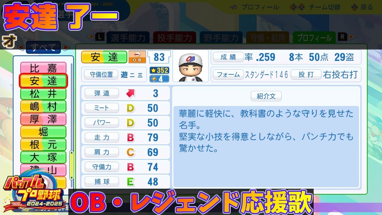 【パワプロ2024-2025】安達 了一【OB・レジェンド選手応援歌】 パワプロ2024-2025のOB・レジェンド選手より、 安達了一選手のパワプロ応援歌 0:00 選手紹介文&バファローズ ORIX Buffaloesオリックス・バファローズ安達了一 NPBHUB.COM | The Fanbase of Nippon Baseball & Nippon Professional Baseball