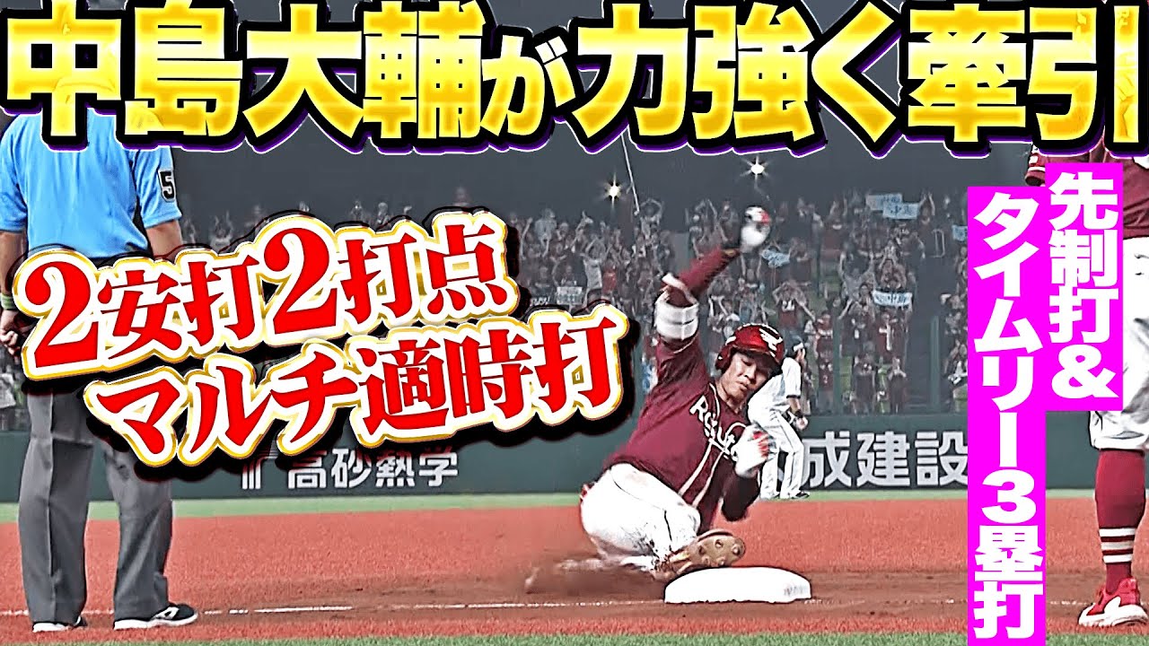 3試合連続で1番起用の東北楽天・中島大輔は2回、1死2,3塁チャンスから先制のタイムリーヒットを放つ!! さらに9回には1死1塁から右中間へのタイムリー3ベースヒットでダメ押し点を叩き出す!! 2本のタイムリーヒットで打線を力強く牽引しました!!
