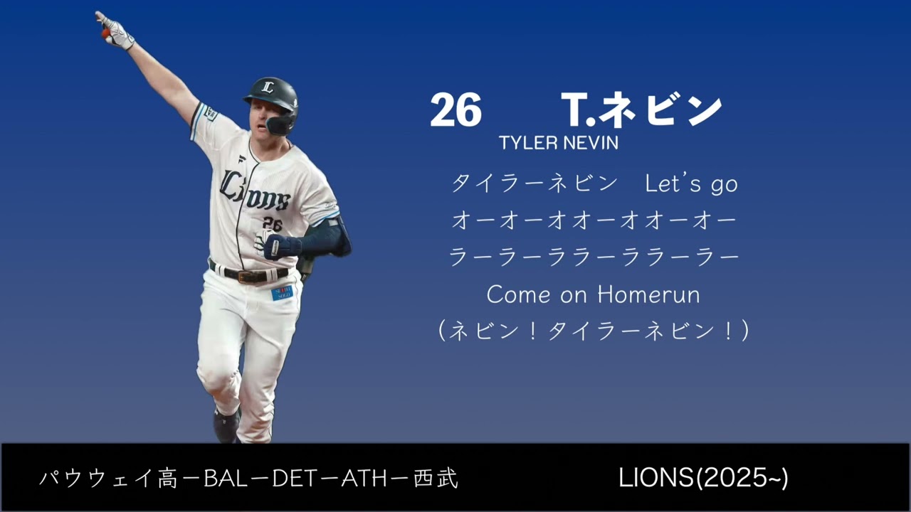 T.ネビン選手 応援歌 【埼玉西武ライオンズ】【2025新応援歌】 タイラー・ネビン選手の新応援歌です。 タイラーネビン Let’s go オーオーオオーオオーオー ラーラーララーララーラー Come on Homerun (ネビン!タイラーネビン!) Saitama Seibu Lions埼玉西武ライオンズ NPBHUB.COM | The Fanbase of Nippon Baseball & Nippon Professional Baseball