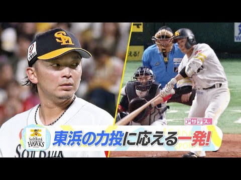首ゲーム差に迫っている3位ホークスは1 点を追う2回。1週間ぶりにスタメンの 谷川が今シーズン初ヒットで出塁。さらに 野村イも繋いで1塁3塁とし得点剣打率3 割を超える牧原。 チャンスでの勝負強さを発揮し、すぐさ 同点に追いつきます。 今シーズン3勝目を狙う先発の東浜は コースギリギリに伸びのあるストレート。 さらには 緩いカーブ。 そして クイック。 バッターのタイミングを惑わしながら西武 打線に追加点を許しません。 打線は4回。ランナーを1人置いて8番 野村イ。 低めを振り抜いて高々と上がった打球は スタンドに飛び込むアーチ。勝ち越しに 成功します。 援護をもらった東山は今年改良重ね打車の手元で動く進化を中心にコントロールが抜群。 7回投げわずか3 アダに抑える後頭を見せます。ラッキーセンです。 7回裏 シュ頭がすさずスタートを切り、この試合 2個目の盗塁を成功させるとその後 チャンスを広げ、打席には4番山川 追加点とはなりません。 8回には高東山の後を受けた藤井が 150km 超いストレートで西武打線を圧倒。 そして9 回杉山も唸るようなストレートでける隙を与えずゲームセット。ホークス山の高等と野村のおよそ 1ヶ月ぶりの1発で西武に勝ち越しです。 本来ならば、あの、先生点を与えないよう にしなきゃいけないんですけど、あの、 そのすぐ次の会に、え、野さんが同点にし てくれたので、え、これ以上失展は、え、 したくないなという思いで、え、マウンド 上がってるからには全部抑えに行こうと いう気持ちで投げてました。 これから本格的に暑くなってきます。 ま、僕も汗きなので大変な時期になるんですけど、え、暑い試合を展開していけるように選手は 1人1 人一生懸命頑張りますので、え、応援よろしくお願いします。今日はありがとうござました。 試合を決めました野村選手です。ナイスバッティングでした。 ありがとうございます。およそ 1 ヶ月ぶりのホームランです。完触はいかがでしたか? 狙いは違うかったんですけどはい。体がうまく反応してくれました。 ま、少し上がりすぎたかなと思ったんです けど。はい。行ってくれました。 1日早いんですけれども、明日は田端です 。どんな願い事をされますか? はい。え、 優勝して、え、ファンの皆さんと共に優勝 を分かち合えるように、え、頑張りたいと 思います。