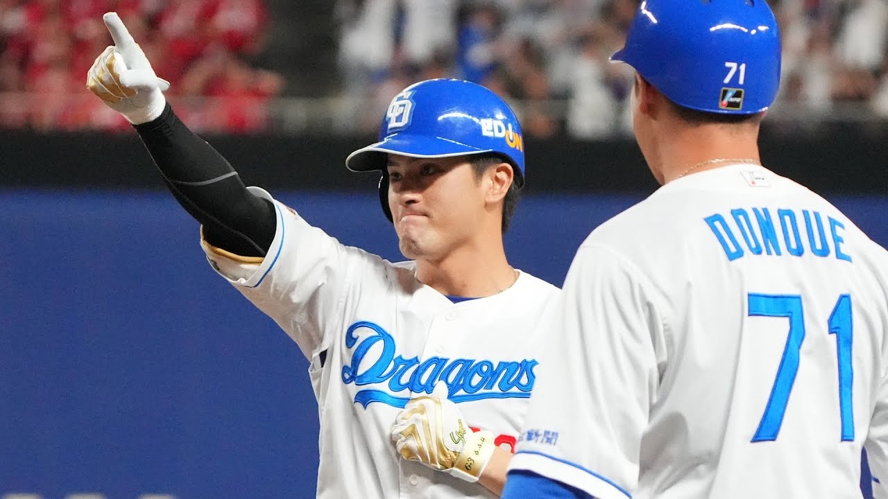 放送席そしてバンテリン道部のドラゴンズファンの皆さんヒーローインタビューです。代打決勝タイムリー板山優太郎選手です。見事のバッティングでした。 やりました。 [拍手] 2アウト満塁という場面でした。 どんな意識で打席に向かったんでしょうか? え、本当にここ最近チャンスで打ててなかったので、え、もう絶対打つっていう、もう決めて打席に入りました。 [拍手] 初球のストレートだったと思いますが、その辺り狙いもあったんでしょうか?え、ま、あの、本当にいいピッチャーだと思うのでストライクに聞きたは全部打つぞっていう気持ちではい。積極的に行きました。 [音楽] 打球は綺麗に3 勇間を破りました。打った瞬間の手応え、そして抜けた時のお気持ちどうだったでしょうか? 最高です。 伊山さん、それにしても代打での打率が引き続き 3 割を超えています。ま、何度も聞かれてラスかもしれませんけれども、代打でこれだけ高結果が出る、どんなことが要因になってるんでしょうか? え、もう本当に 120%の準備を、あ、することがはい。 もう結果は後からついてくると思って、もう 120% 常に準備するっていうことだけ考えてやってます。 [拍手] さあ、そして差し使えなければですが、先ほどマウンドのエンジンではどんな言葉をかけられたんでしょうか? え、オールスターまで残り8 試合全部勝ちましょうという風に言いました。チームも [拍手] 1つ踏ん張りどころかと思います。 改めて、え、ファンの皆さんにこれからの戦いにつ向けていただけますでしょうか? え、本当に目の前の試合を全員で力合わせて、え、頑張っていくので引き続き応援よろしくお願いします。 [音楽] ありがとうございました。 ありがとうございました。 今日のヒーローは板山優太郎選手でした。放送席どうぞ。 ドラゴンズ井上監督です。え、清水投手便の中で 9会場藤投手に託しましたが見に 0に抑えました。どました? あ、まあ、清水もね、え、東北シリーズですごく、まあ、いろんな思いもしてで、ま、ギリギリの中で投げたっていう。 [音楽] で、ま、あの、本人もそんなに僕は、あの 、彼は心臓に気が生えてるなっていう風に 思うんですけども、そんなに同揺すること もなくっていう形ではあるんですが、ま、 ちょっと今日は、あ、その東北に行く前も また議をやったりとかね、ちょっと負担を かけていたので、ま、今日は思いきり ちょっとこう外してみるかという中で、 じゃあ次に心臓に木履いてるのは誰だって いう、ま、そこで藤島という う、中でいい仕事をね、ま、堂々としてくれました。 え、先発のマ投手については改めてどんな風に? うん。いや、あの、前回ちょっと反省材料が多かったんですけど、今日はそこはね、すごく意識してやってましたね。で、あの、店舗であったりとかベースカバーであったりとかちょっと遅れた部分もありましたけども、ま、あの、必死さっていうのはすごく伝わったし、もうあの彼が日本で成功したいという思いっていうのは十々伝わってくるような内容。 ま、これから後半に向けて彼がどれくらいね、え、回転してくれるかっていうのはすごく、ま、期待はしてますけどね。あの、 1069を投げた後に7 回も、ま、続頭ということになりましたが、あの辺りのご判断っていうのは、 そうですね、あそこも、ま、ちょっとピッチングコーチと話をして、え、どうしようかなって迷ったんですけども。うん。 まあでも僕の中で、え、カエルマラーはパッと見た時に、あ、まだスタミナあるなっていう風に思ったので、よし、もう 1 人行くかっていう形で決断しました。はい。 それは彼の表情だった。 表情とま、でもね、あの、行かせた後にちょっとうわ、やばいなっていう風なね、形もちょっと見えたんでね。ま、途中で交代になりましたけども、ま、生きれるもんならあ、生かして生かしたいという風に思って判断しましたけどね。 え、打線では代打の板山選手が見事に 1発で仕留めました。 はい。あの、ま、ロースコア、あ、ま、ね 、カープさんも、ま、エース級の森下君が 投げるということで、ま、今日も ロースカーだろうなっていうところの中で 、ま、ジェーソンがね、バカンと打って くれたんで、よし、ちょっと部があるか なって思ったところで、やはり、え、 カープさんもしつこくこうね、童貞に するっていう。で、ま、あそこでもう ちょっと迷はありましたけども、そろそろ 板山も打ってくれるやろという、もう なんかある意味ちょっとこううん。 ま、僕の感なんですけども、なんかそろそろ出るんじゃないのっていう、ま、見事にああ、打ってくれましたね。はい。明日に向けても一言最後にいただけますか? はい。あの、もちろんこれで満足することなく、うん。前回のカープ戦も、え、仮がありますしね。 [音楽] で、ま、もちろんカープさんだけじゃなく て、他のチームと戦う時でももう気持ちと か戦う逃走心っていうのは一緒ですけども 、やはり
