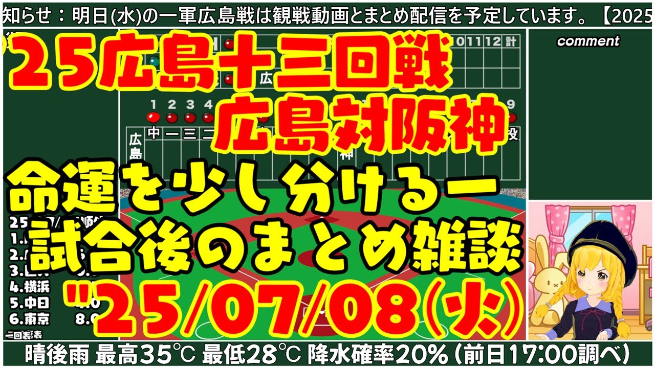 【対広島十三回戦終了後】”25/07/08(火) 広島対阪神 命運を少し分ける三連戦 まとめ雑談と明日の見所さん【まいちゃん野球ラジオ】