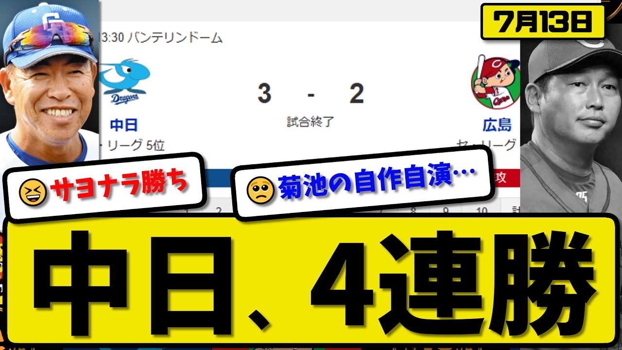 【セ3位vs5位】中日ドラゴンズが広島カープに3-2で勝利…7月13日サヨナラ勝ちで4連勝…先発松葉7回2失点…ブライト&細川&ボスラーが活躍【最新・反応集・なんJ・2ch】プロ野球