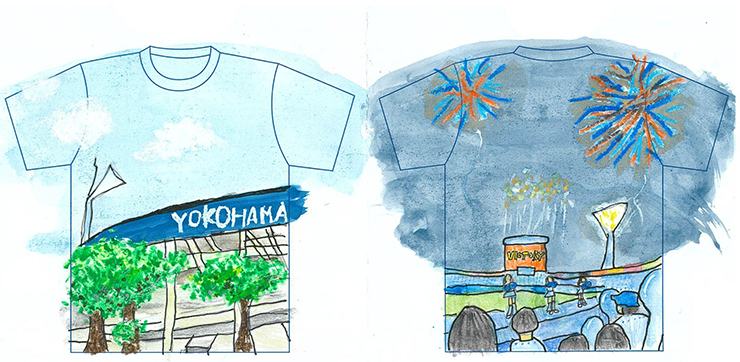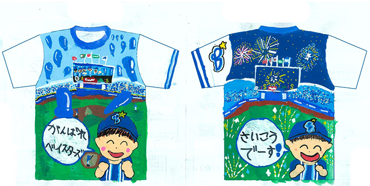 このデザインは、応えんを楽しくするベイスターズの応えんグッズとハマスタで売っているおいしい食べ物で楽しい思い出をつくれたので描きました。球場にいるDB.スターマンなどのキャラクターを描きました。