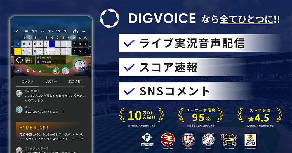 パ・リーグ6球団およびパシフィックリーグマーケティング株式会社(本社:東京都港区、代表取締役CEO:新井 仁)は、ヒアートゥー株式会社と2025年シーズンにおけるパートナーシップ契約を締結し、ヒアートゥーが運営する「DIGVOICE」が2025年シーズンのパ・リーグ6球団公認 ライブ実況 ファンアプリとして認定しております。
