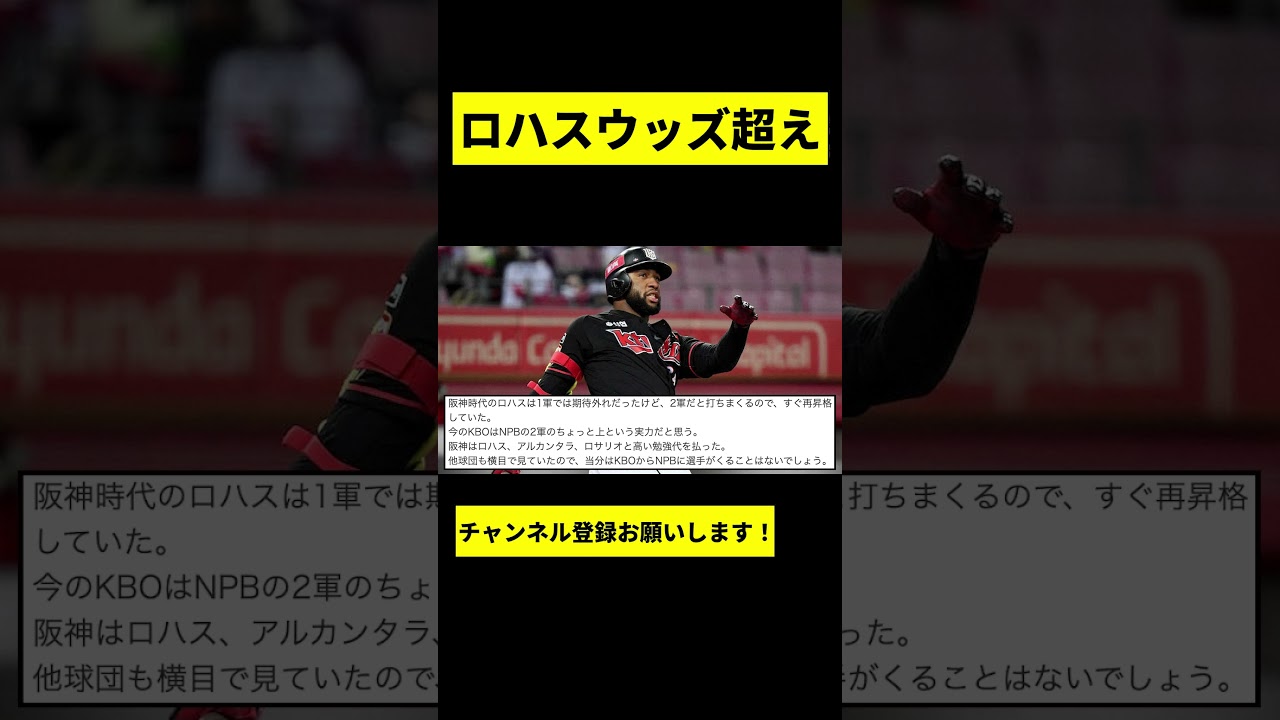 ロハス決定する。阪神では不発も韓国9会 で大復活23年ぶり記録更新元スケットが 到達した175勝って阪神でプレイした スケットが23年ぶりに記録を塗り換えた 韓国プロ野球KBOのKTウズに所属する ルメルーロハスジュニアガイアが3日急務 線で11号2ラを放ちKBO通算175 本塁打を記録外国人打者の通算本塁打で新 記録を達成した韓国で大活躍の強打者 ロサリをロハスと続けて通用しなかった こともありNPB投手のレベルの高さを みんなが認識したと思います。会出身選手 に限らず近年スケット街がい、黒人は ほとんどが跳ね返されていますね。ロハス は韓国の野球が非常によくあっている。 これからも頑張って欲しい。阪神時代の ロハスは1軍では期待外れだったけど2軍 だと落ちまくるのですぐ最昇格していた。 今のKBOはNPBの2軍のちょっと上と いう実力だと思う。阪神はロハス アルカンタラロサリオと会弁兄弟を払った 他球団も横目で見ていたので当分はKBO からNPBに選手が来ることはない でしょう。昔は日本の野球のライバルは 韓国だって言われてたけど、それは過去の 話。当手のレベルが日本は東高かだて韓国 はその逆だから3巻多いのレベルでも日本 では通用するかは今は何ともロハスには 韓国で頑張ってほしいね。ありえない話だ が大谷が韓国でプレイしたら2年で175 本位打ちそうだけど阪神のおかげで韓国で 何本HR打とうが何しようが精査しないと 日本では通用しないということが分かった 。日本もHRを争いしてるのは外国人 ばかりだった頃と同じ感じかな。もちろん おファンとサンズは良かったので全員ダメ というわけではないし。MLBから来た 選手でも近年はHRを争いする選手は めっきり減ったので日本の投手のレベルの 高さとおそらくゴールが飛ばなくなったの が分かる。ご視聴ありがとうございました 。 [音楽]